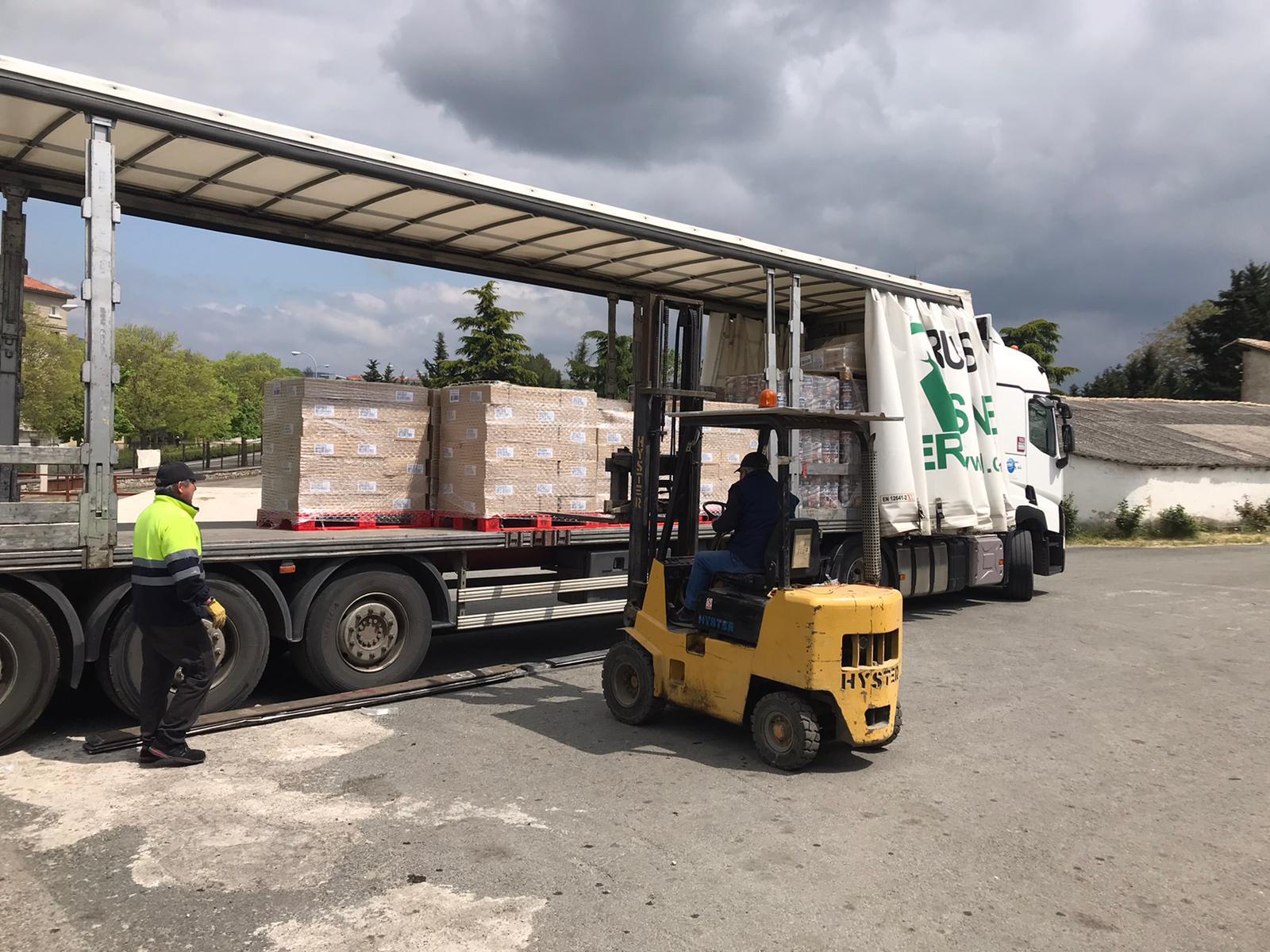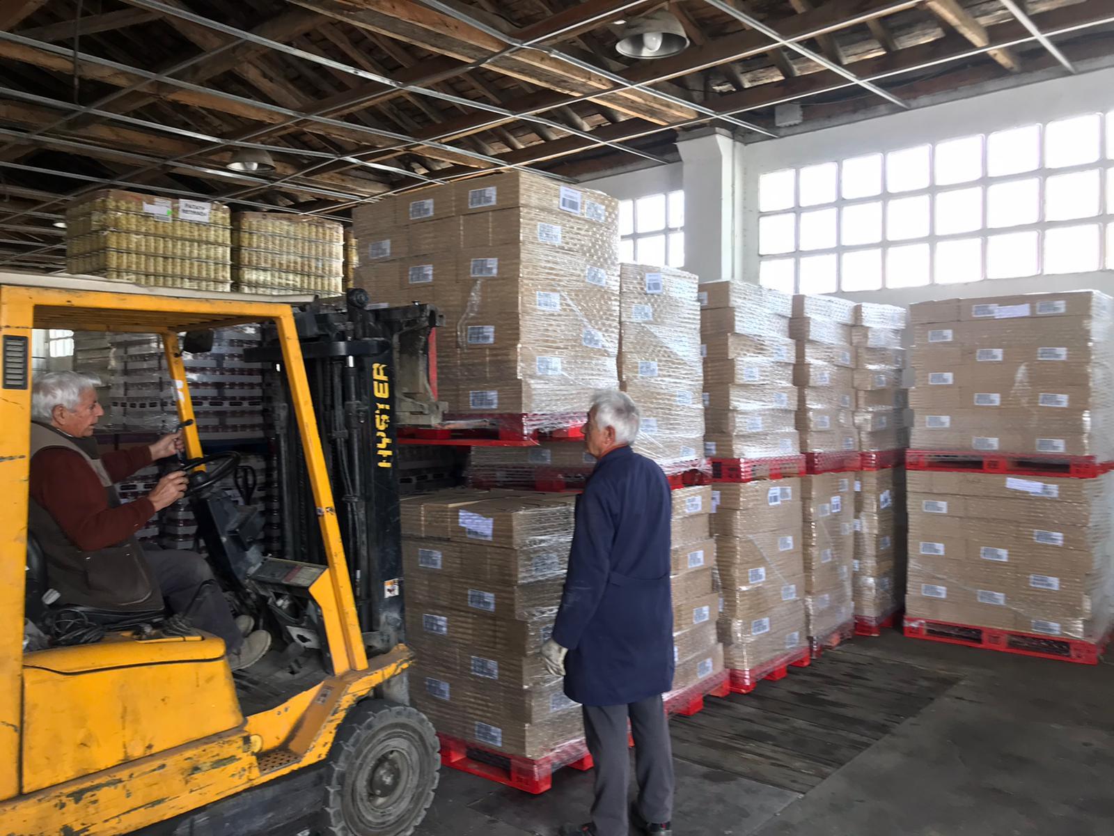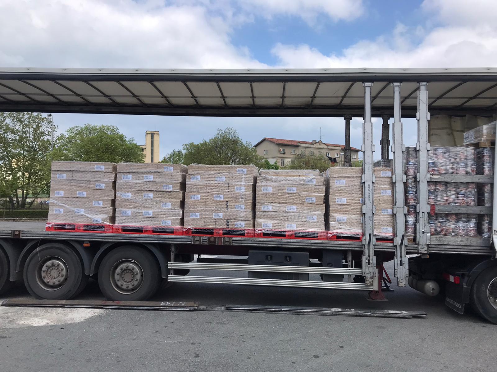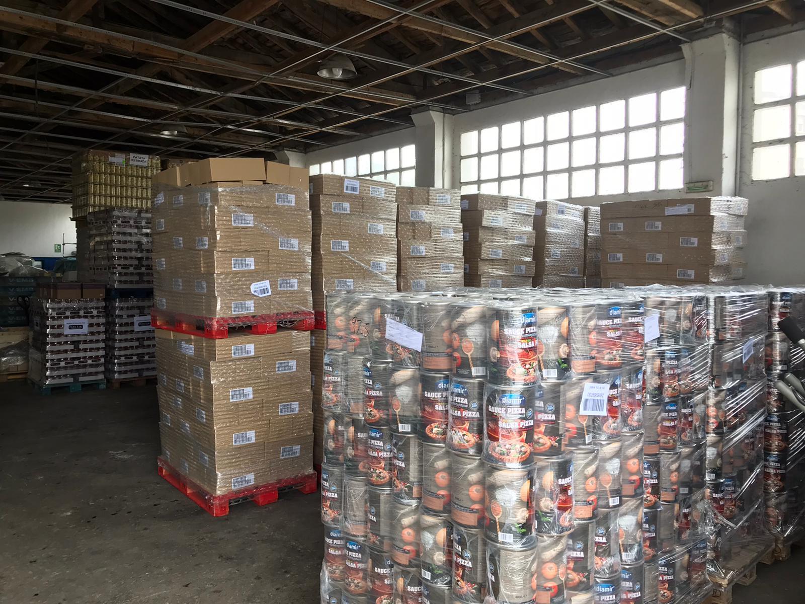 Alimentos para Ucrania recibidos por Conservas IAN : 12 pallets de fabes con almejas , 6 de salsa bolognesa y 13 de fabada Asturiana.