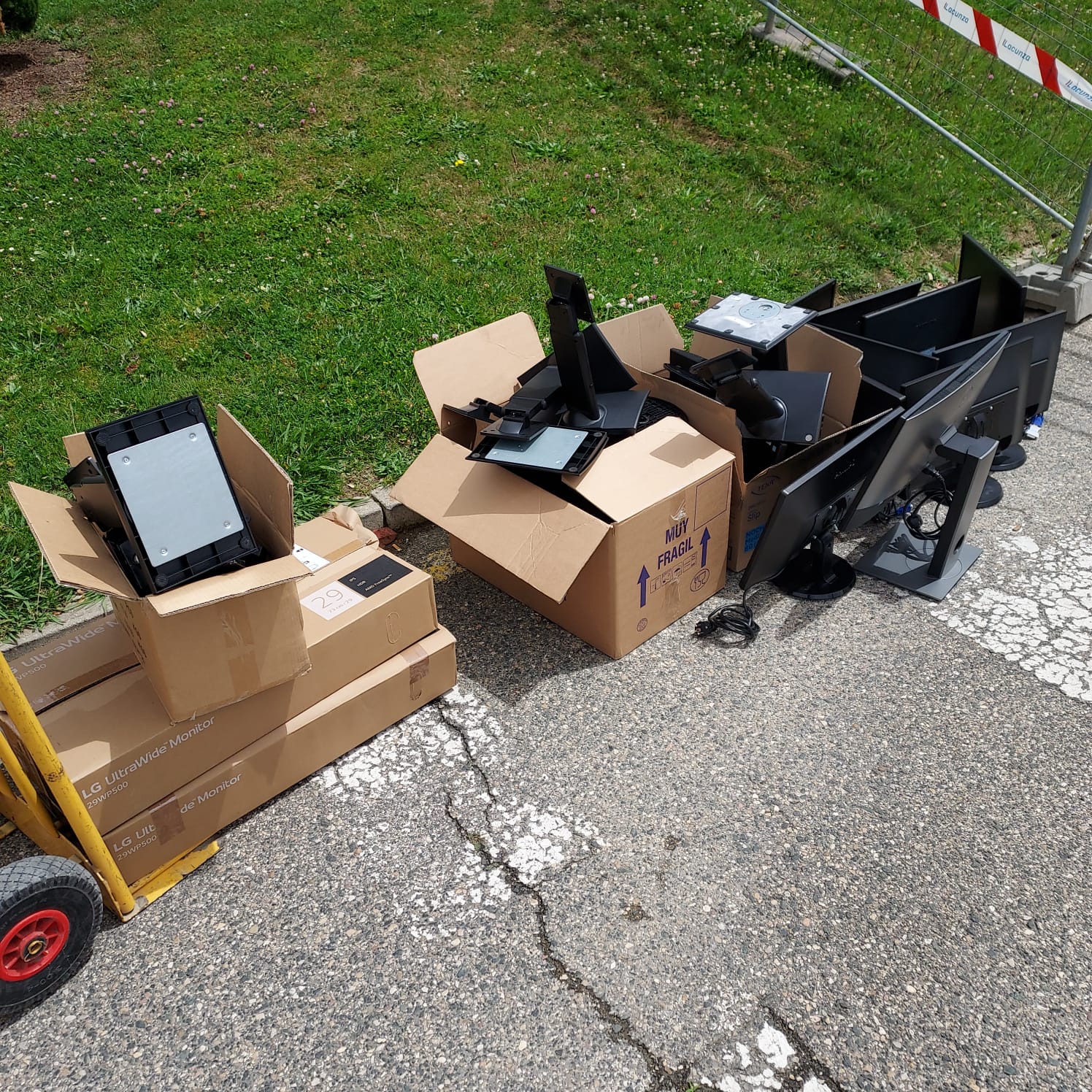 Recibimos 2 pantallas de ordenador, 17 pantallas, 6 pies soportes de pantallas y una caja de soportes de pared para pantallas.