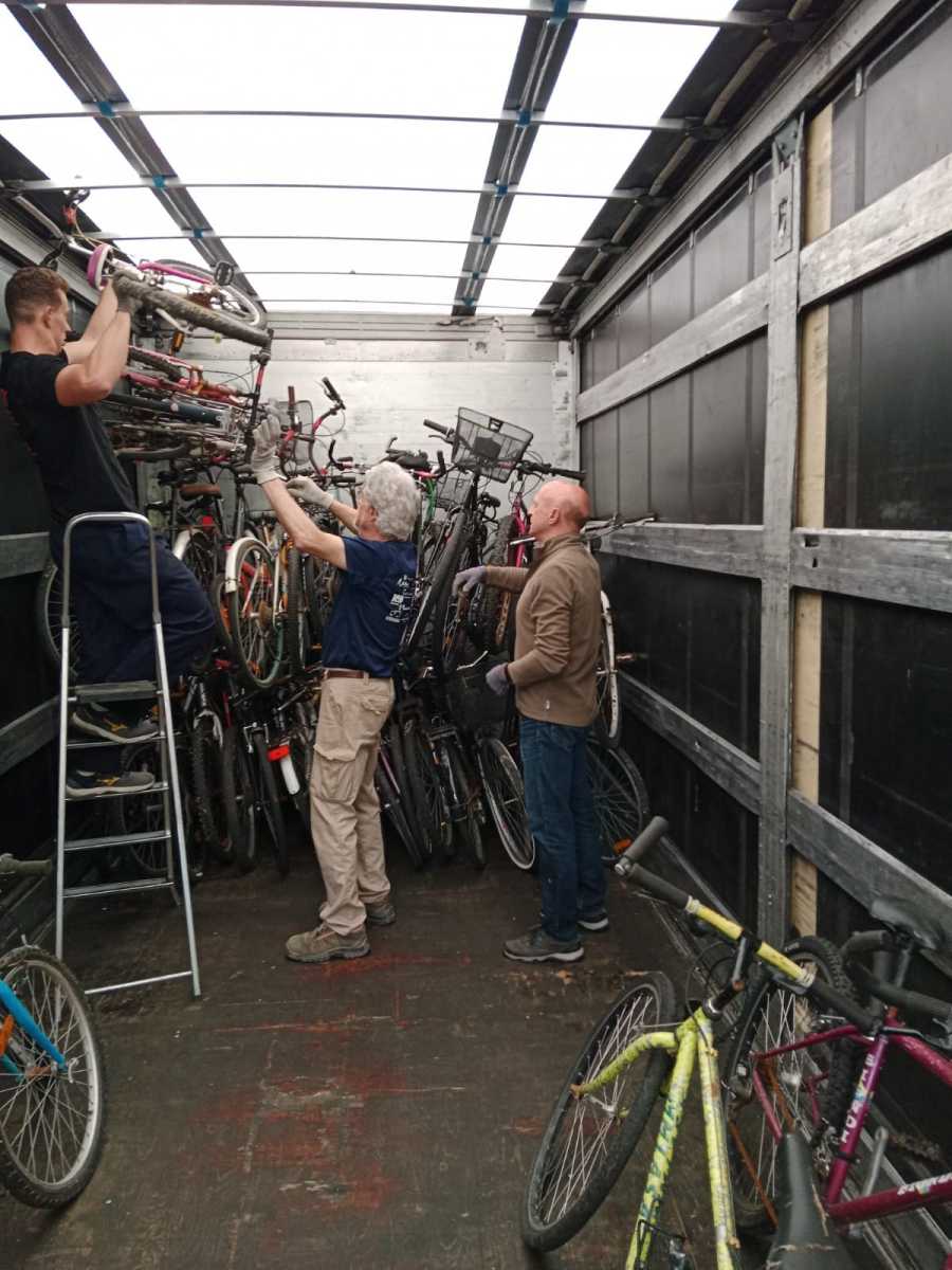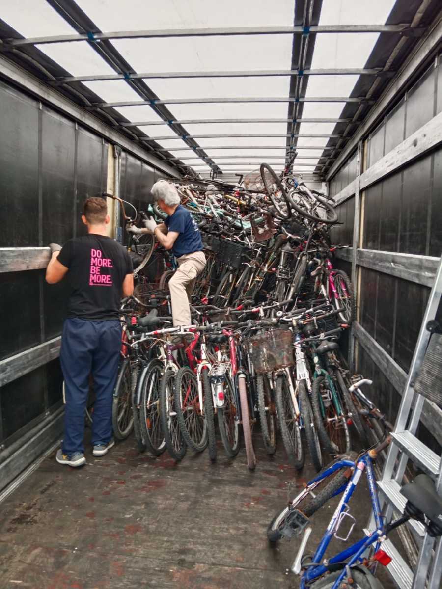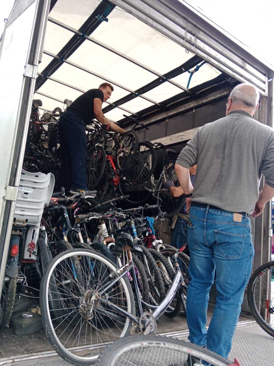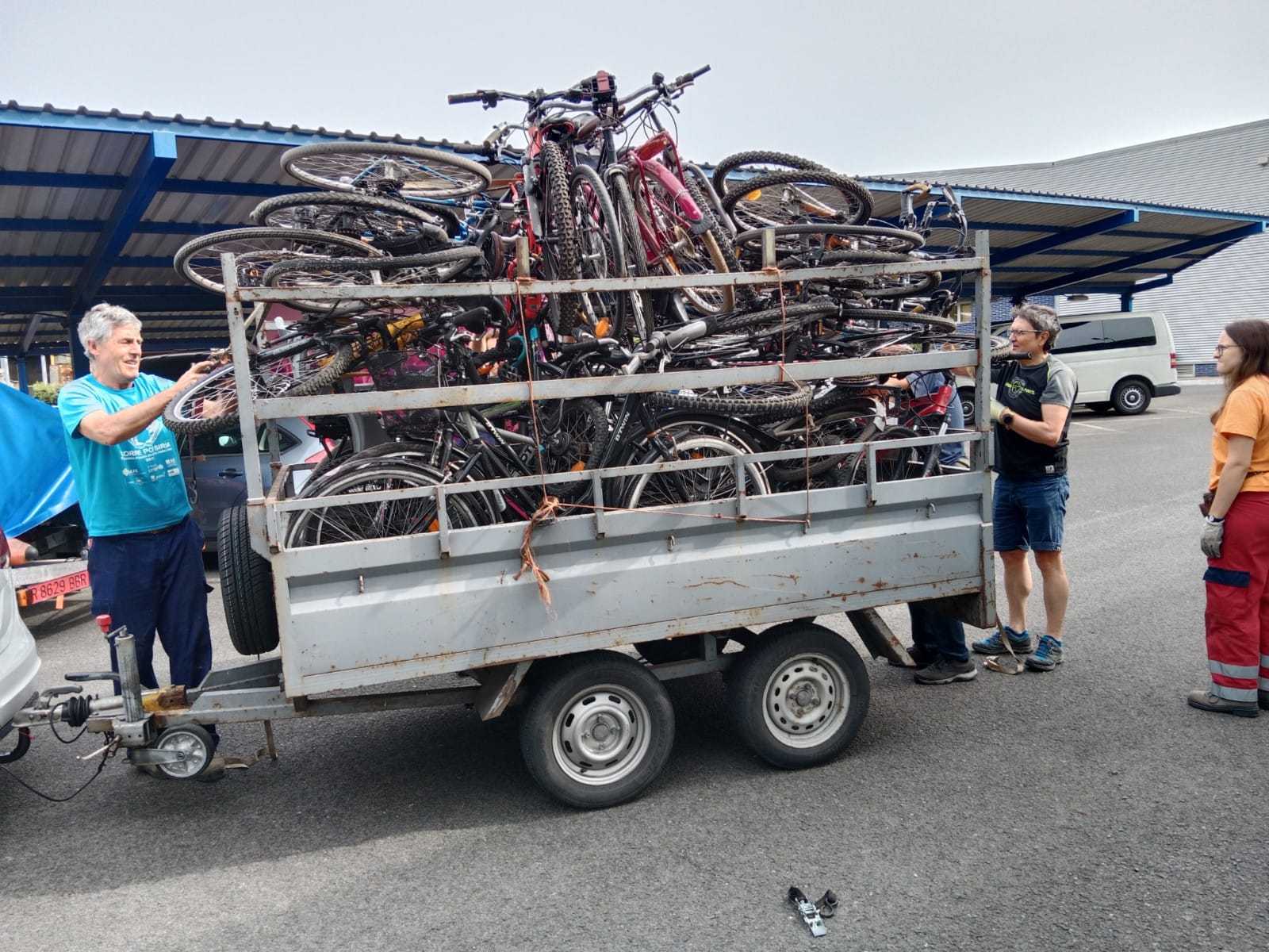 El lunes 8 de Mayo de 2023, un grupo de voluntarios/as se han desplazado hasta San Sebastián para recoger una donación de 300 bicicletas, que una vez cargadas y tras el viaje de vuelta  se han almacenado en nuestras instalaciones para ser revisadas, puestas a punto y posteriormente ser enviadas a distintos destinos.