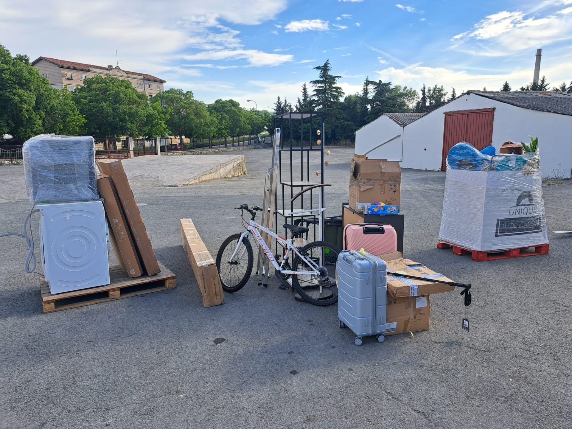 El día 18 de junio de 2024 hemos recogido en E. Leclerc una donación de 4 palés de diversos materiales como una lavadora, un horno, un mueble cajonera, un mueble estantería, una escalera de mano, dos percheros, dos maletas, dos sillas de playa…