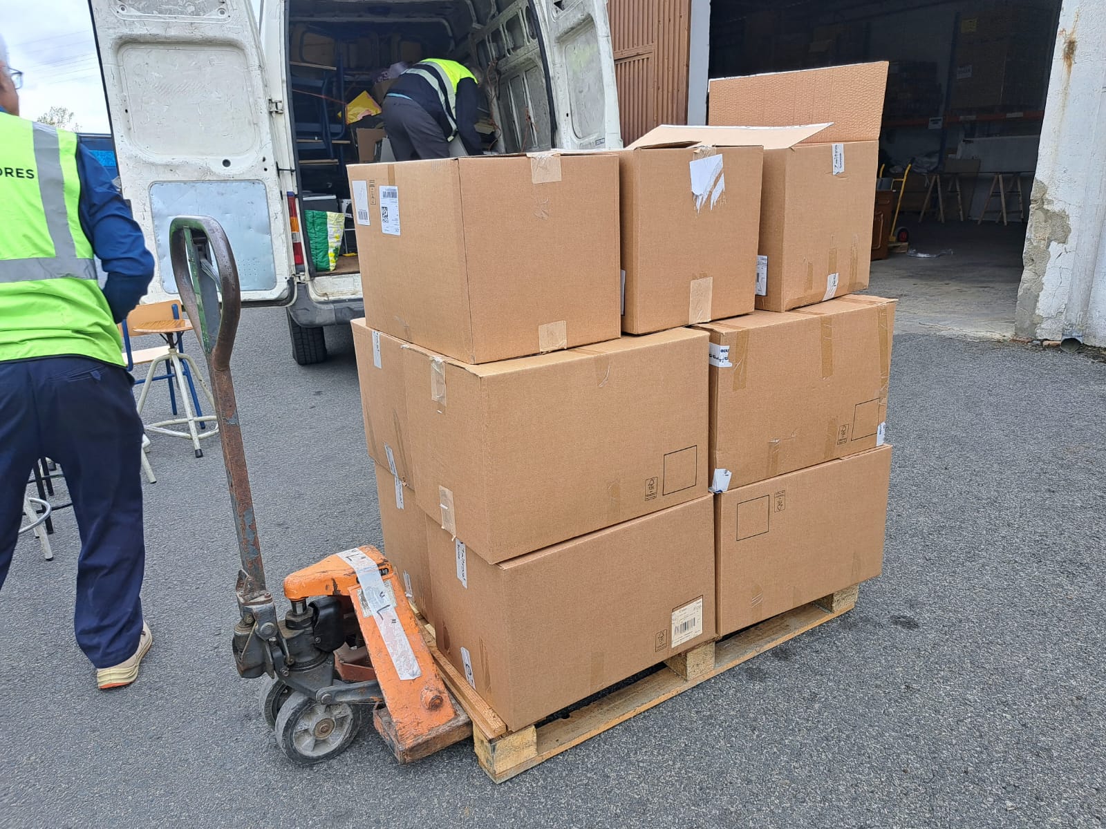 El día 9 de octubre de 2025 nos desplazamos hasta Zarautz para recoger una donación de once cajas de materiales diversos de Eroski.