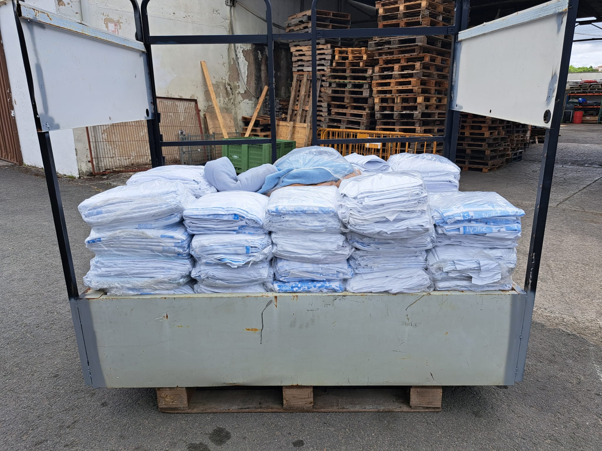 El día 11 de junio de 2024 hemos recogido una donación procedente de la empresa Escor de Vitoria, consistente en tres palés de sábanas.