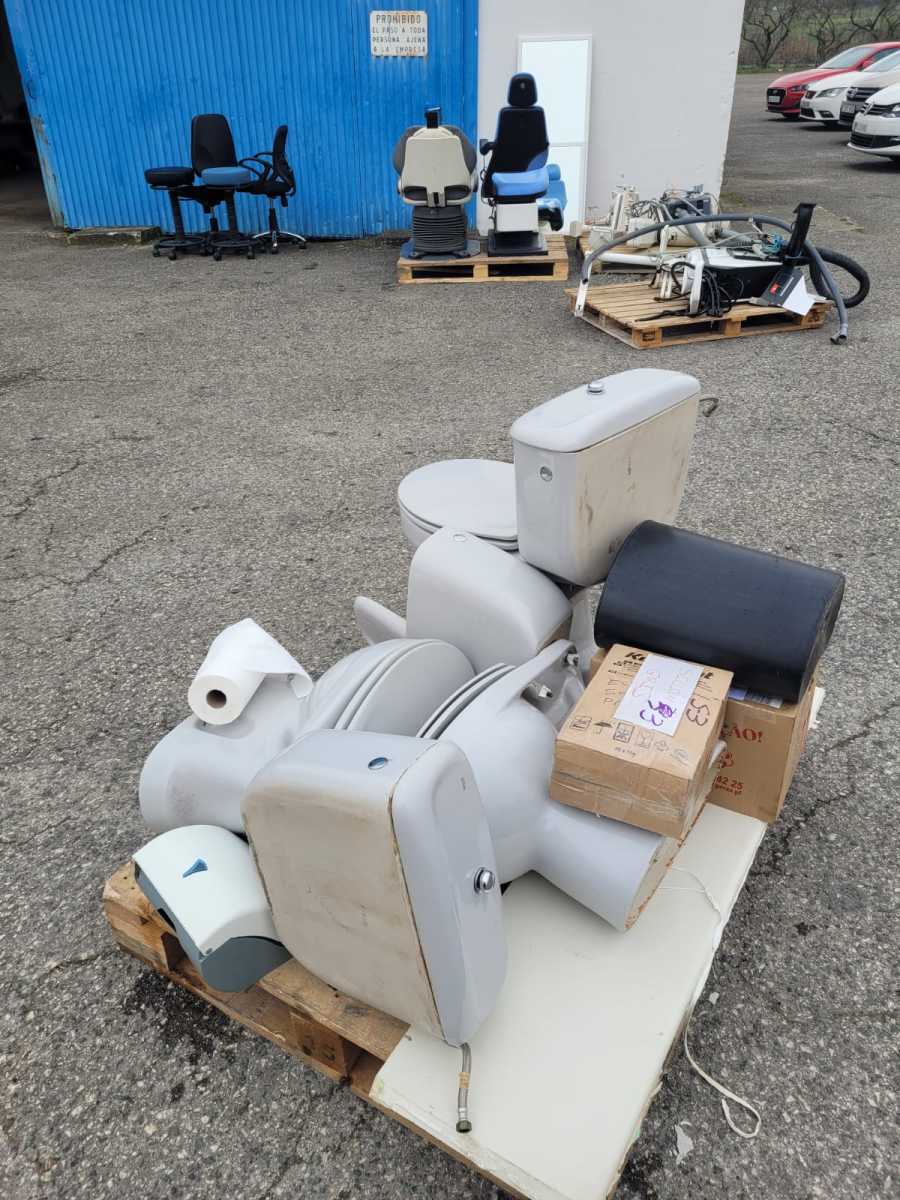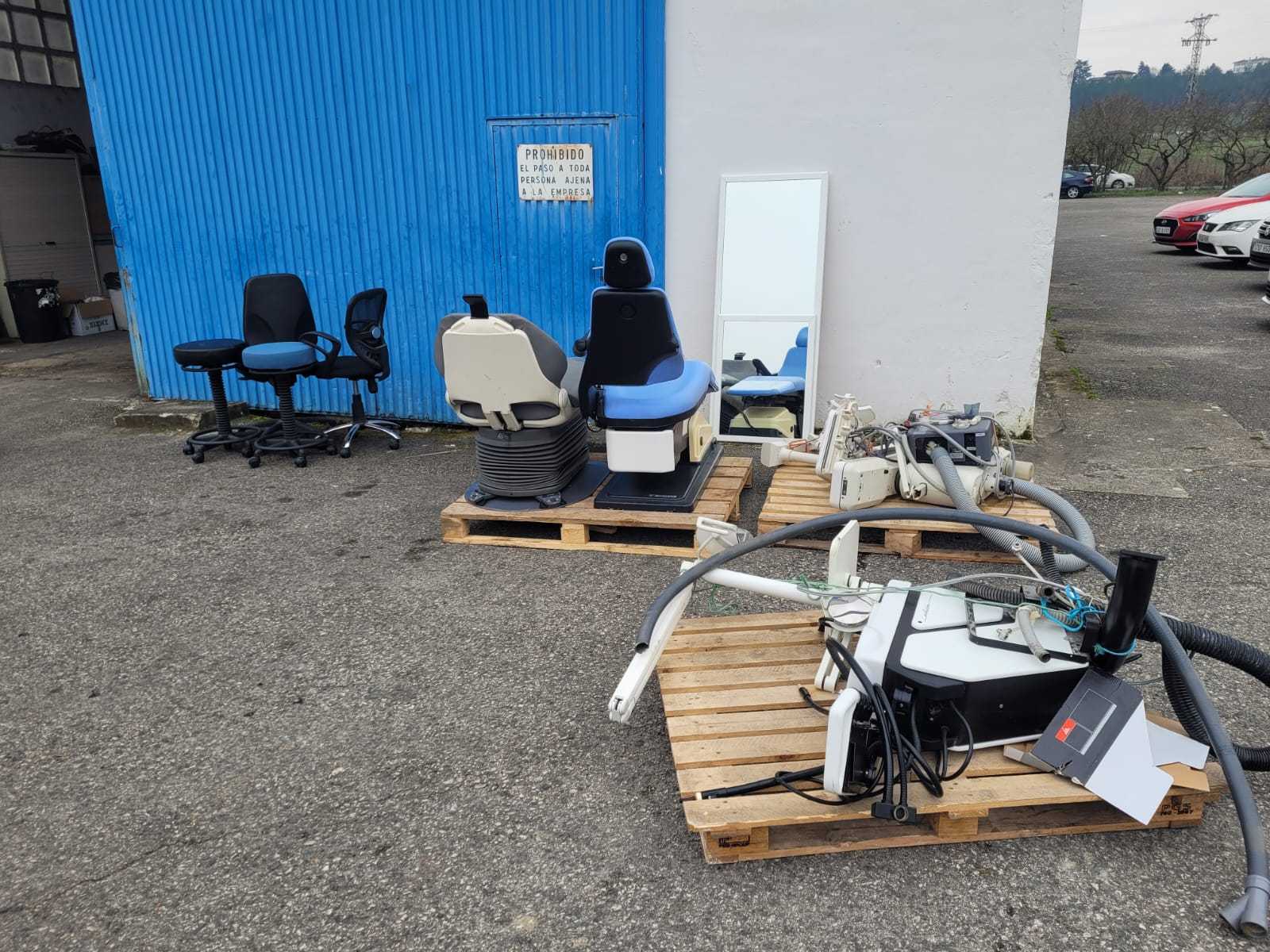 3 sillones de dentista, 3 compresores, 3 aspiradores, varias cajas con el instrumental y otros accesorios de consulta, 3 armarios fregaderos, un lavabo de baño, dos espejos, 3 portarollos, 4 taburetes de dentista, 3 tazas de baño, un armario pequeño de baño, un frigorífico, 8 puertas