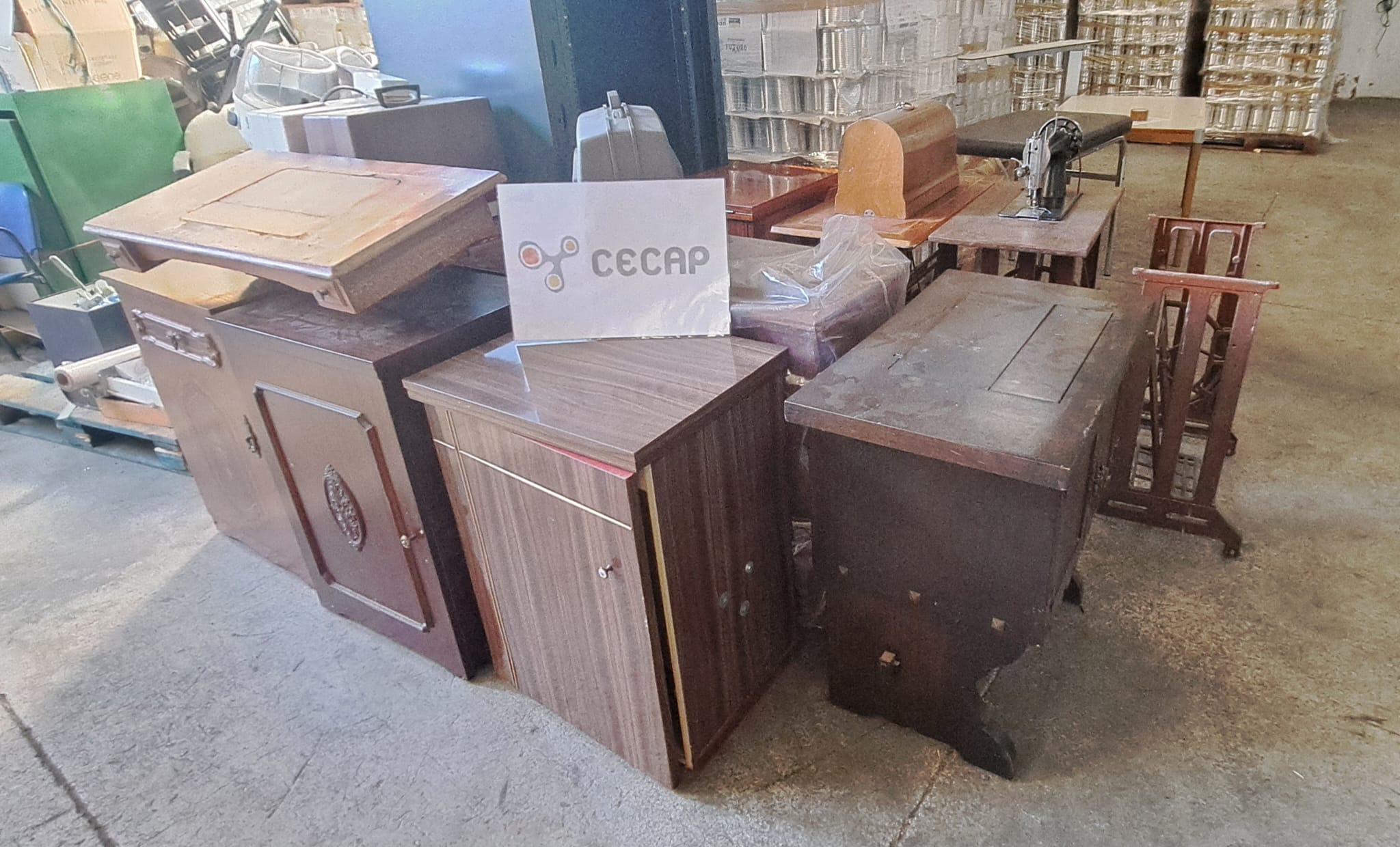 14 máquinas de coser, 37 monitores ordenador, 250 cuadernos, 2 lámparas de pie, 2 radiadores y 6 sillas.