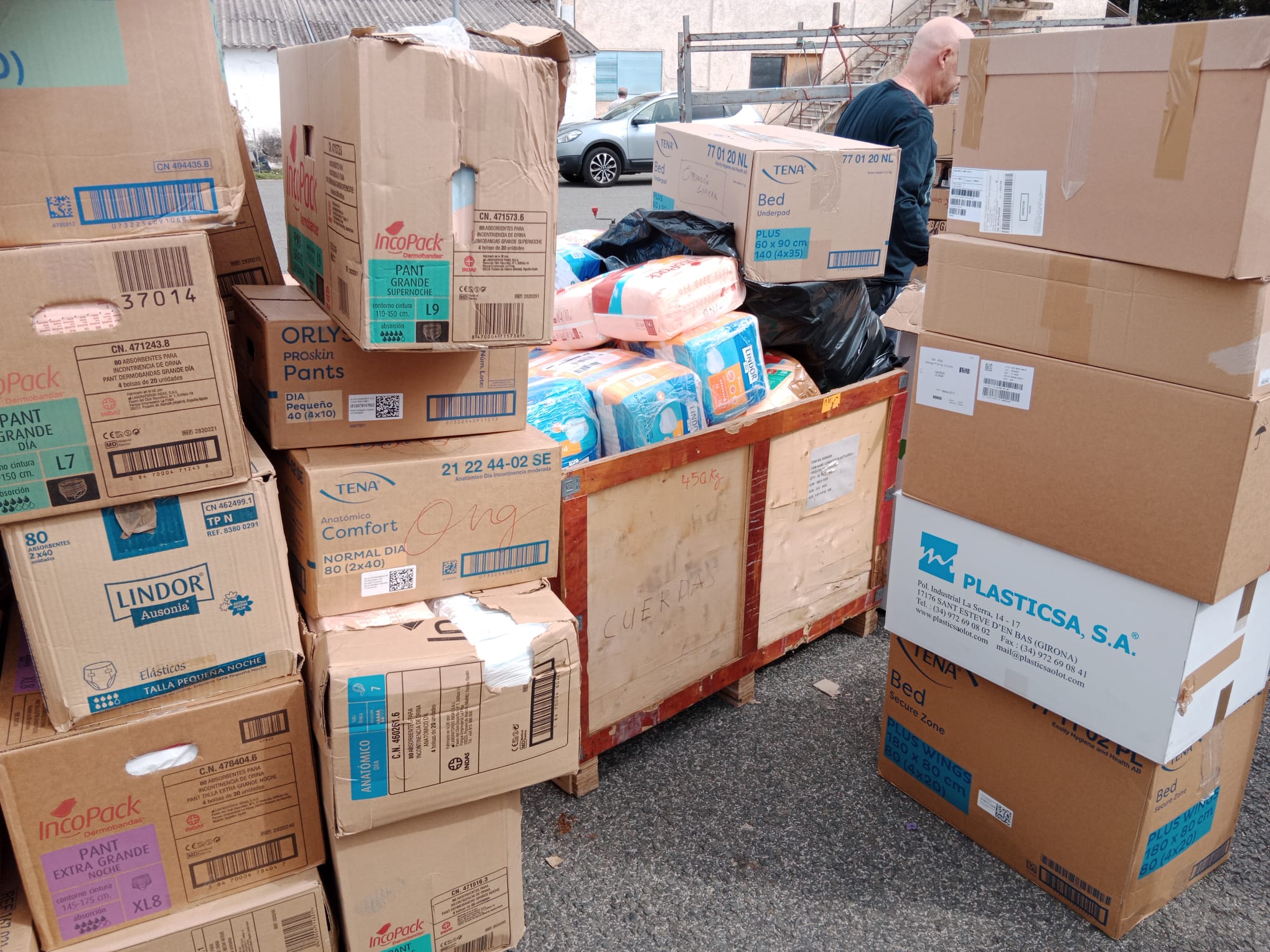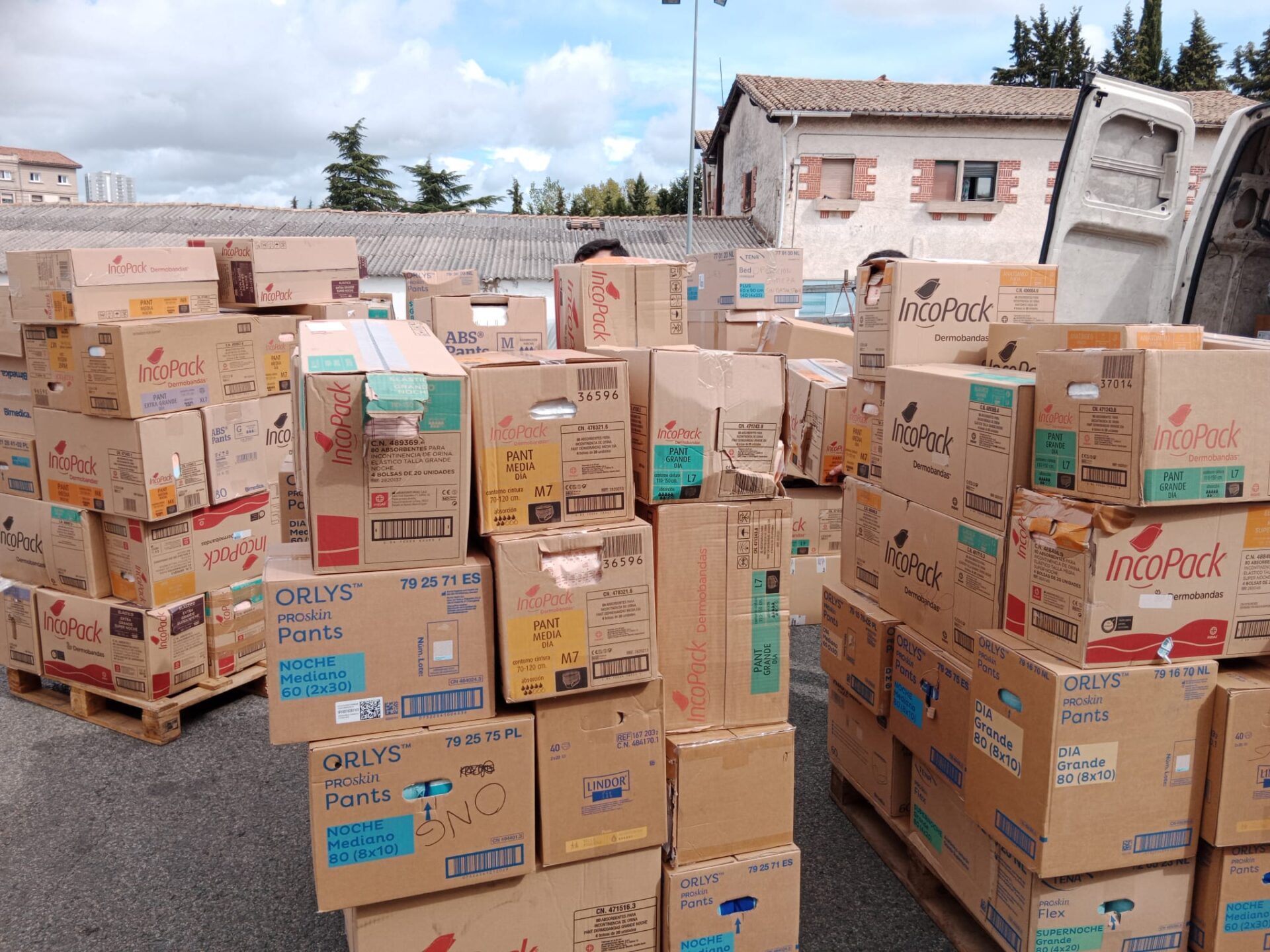 El día 5 de septiembre de 2024 nos desplazamos hasta Lasarte para recoger una donación de 6 palés de pañales, 1 de mascarillas y 2 cajones de medicamentos de la Distribuidora Farmacéutica Guipuzcoana, DFG.