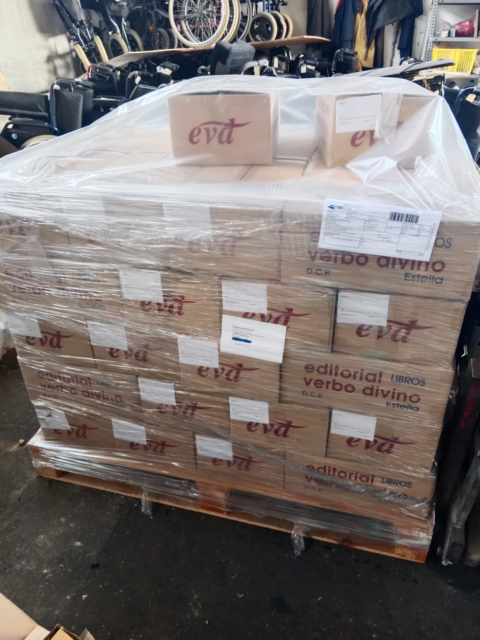 El día 24 de julio de 2025 recibimos en nuestras instalaciones la donación de un palé de libros procedentes de la Editorial Verbo Divino.