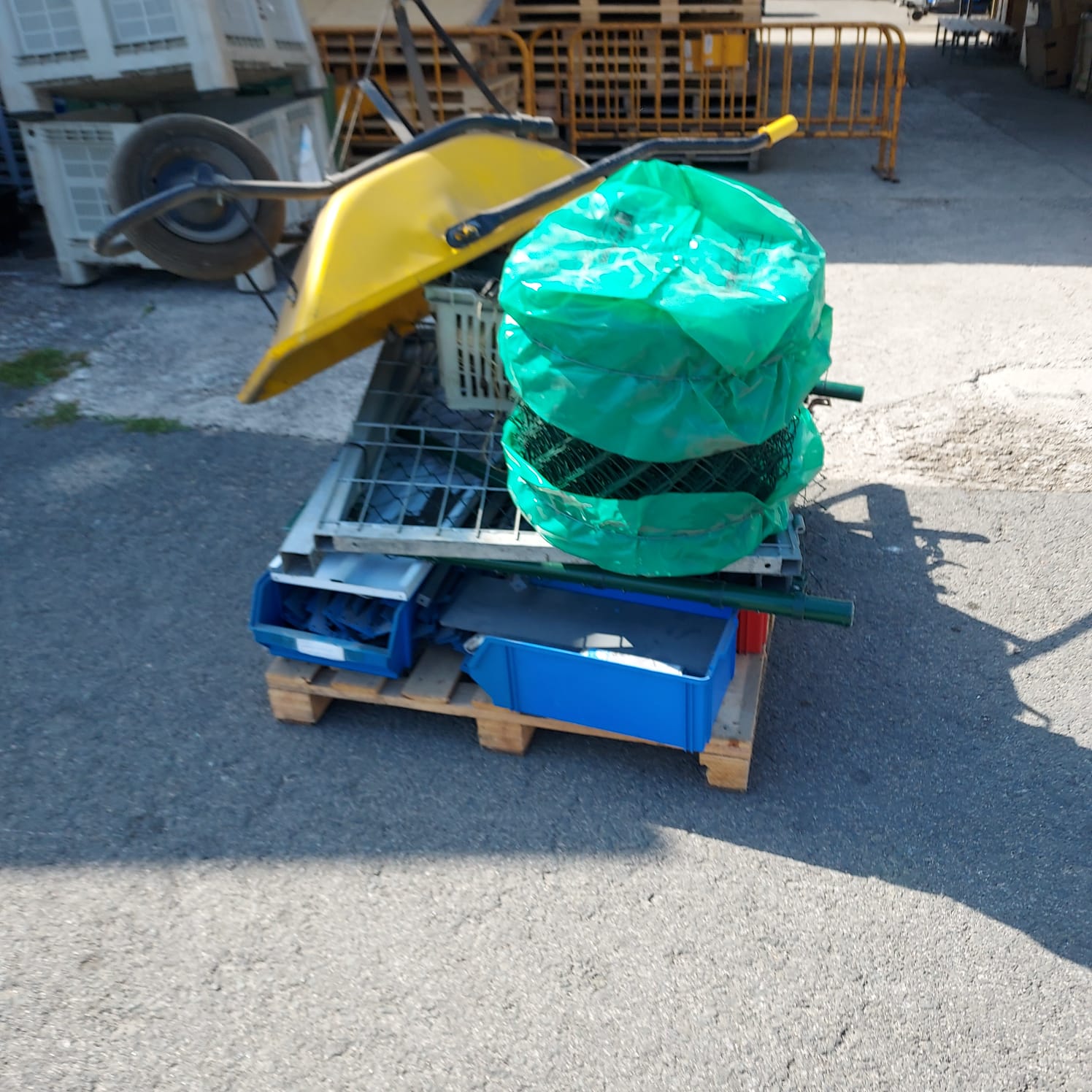 El día 8 de agosto de 2025 hemos recibido en nuestras instalaciones una donación de la Ferretería Irigaray de Pamplona consistente en tres palés de pintura, un palé de malla deployé, un carretilla, y pies de estanterías con sus barras de refuerzo horizontales.