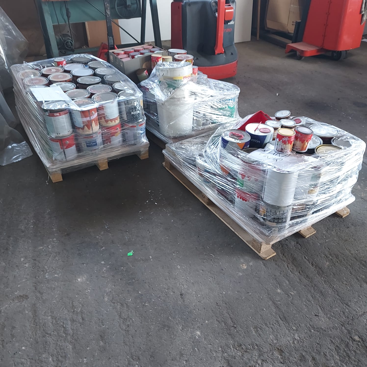 El día 8 de agosto de 2025 hemos recibido en nuestras instalaciones una donación de la Ferretería Irigaray de Pamplona consistente en tres palés de pintura, un palé de malla deployé, un carretilla, y pies de estanterías con sus barras de refuerzo horizontales.