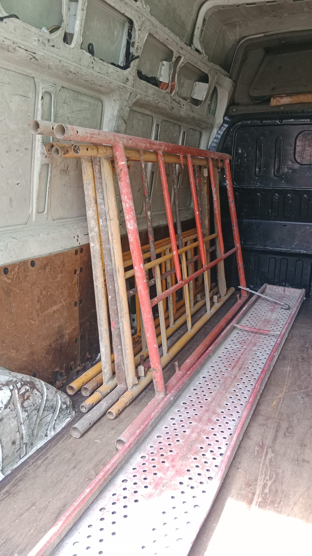6 pantallas, 6 CPUs, una máquina de coser, 12 cajas de libros infantiles, 6 cajas de ropa, un armoniun, varias mesas, puertas y andamios.