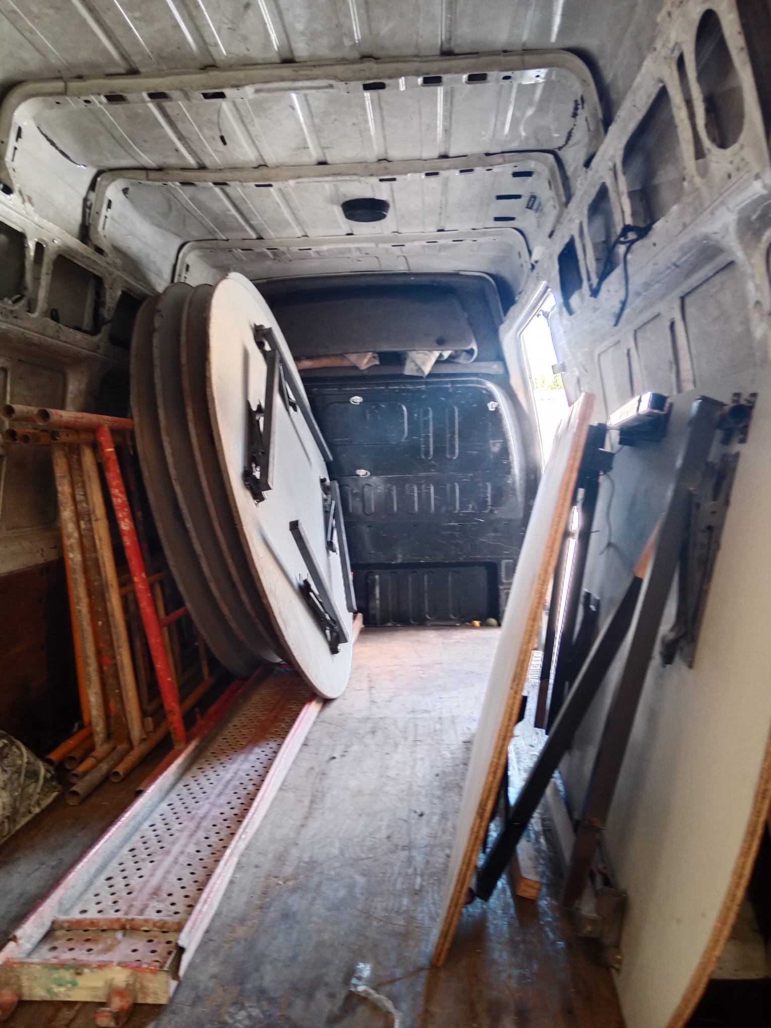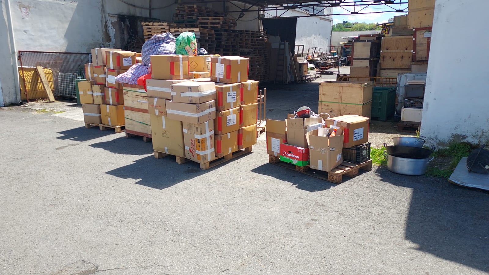 6 pantallas, 6 CPUs, una máquina de coser, 12 cajas de libros infantiles, 6 cajas de ropa, un armoniun, varias mesas, puertas y andamios.