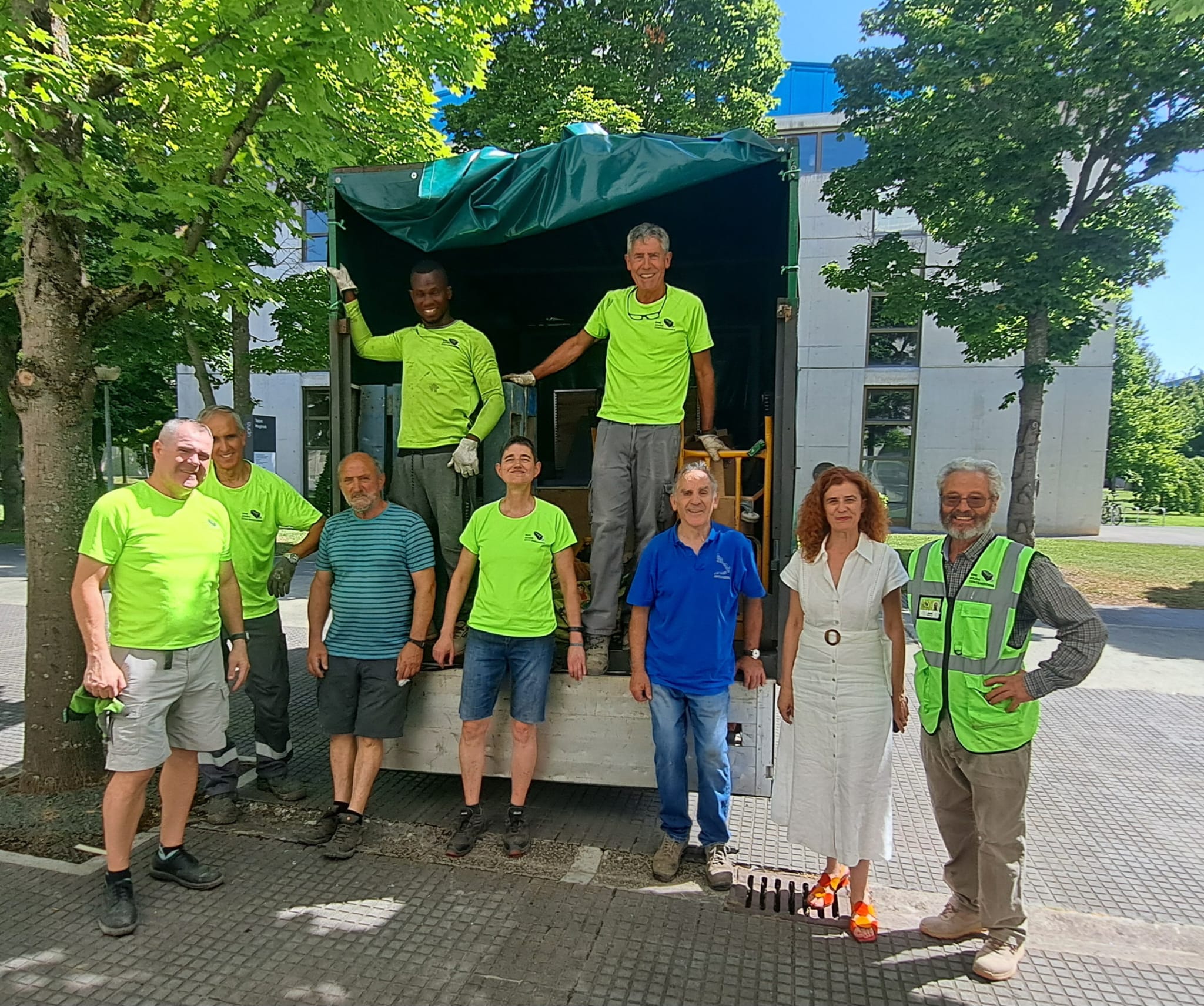 En la mañana del día 30 de junio de 2025, un grupo de voluntarios/as nos desplazamos hasta la UPNA, Universidad Pública de Navarra, para hacernos cargo de una donación de 95 estanterías de la biblioteca.