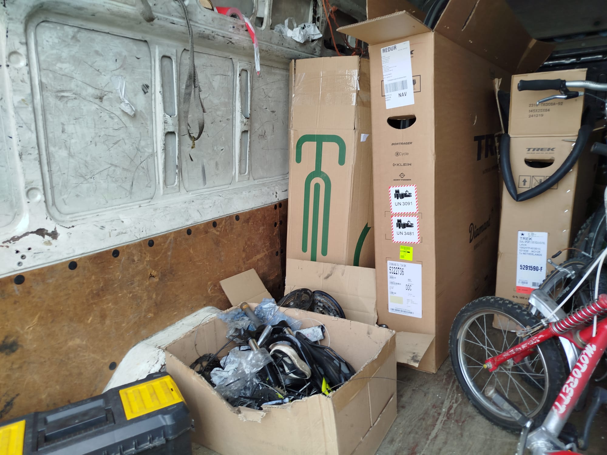 El día 11 de abril de 2025 hemos recogido una donación de Iruña Bikes de Pamplona consistente en unas cajas con diversos materiales, cámaras cubiertas repuestos.