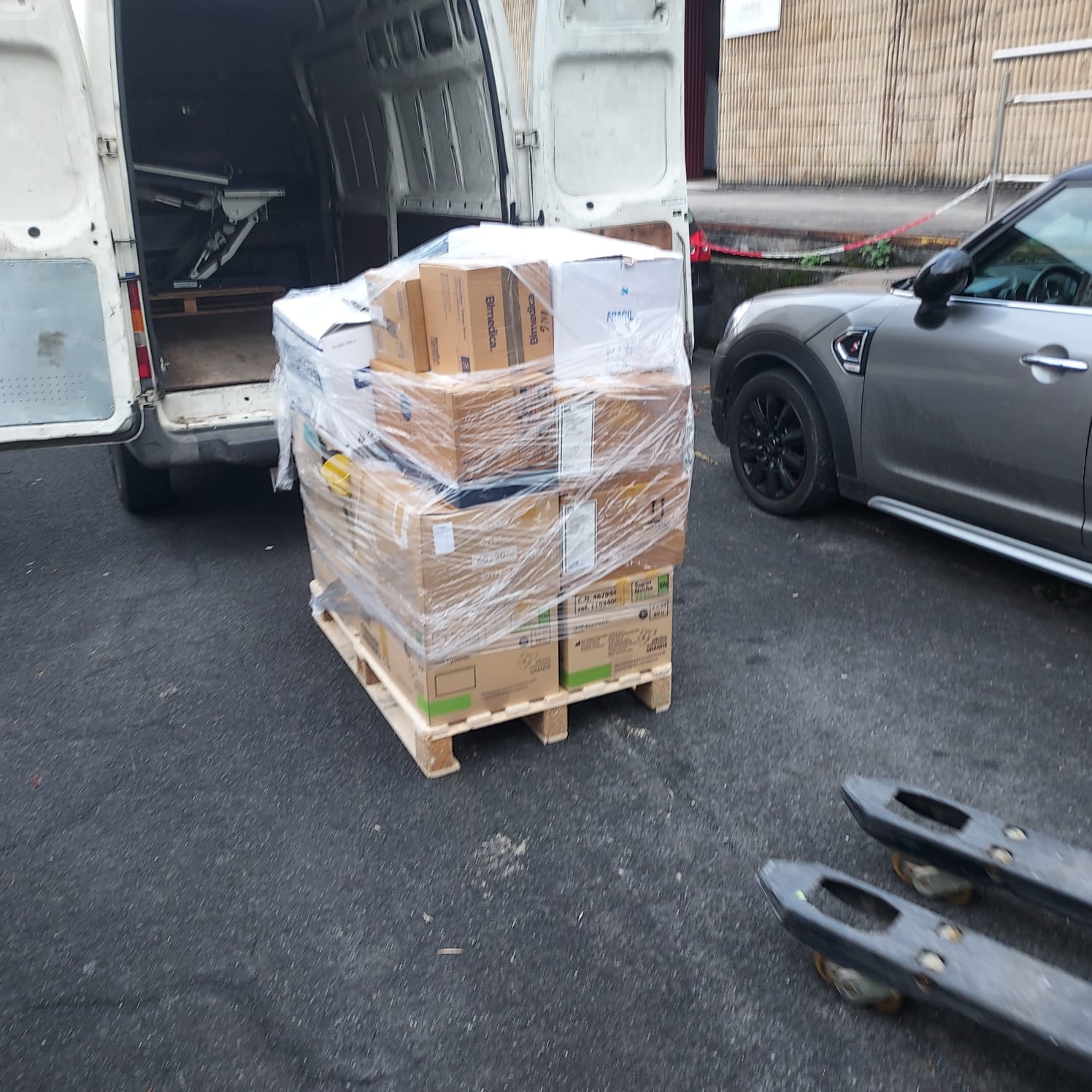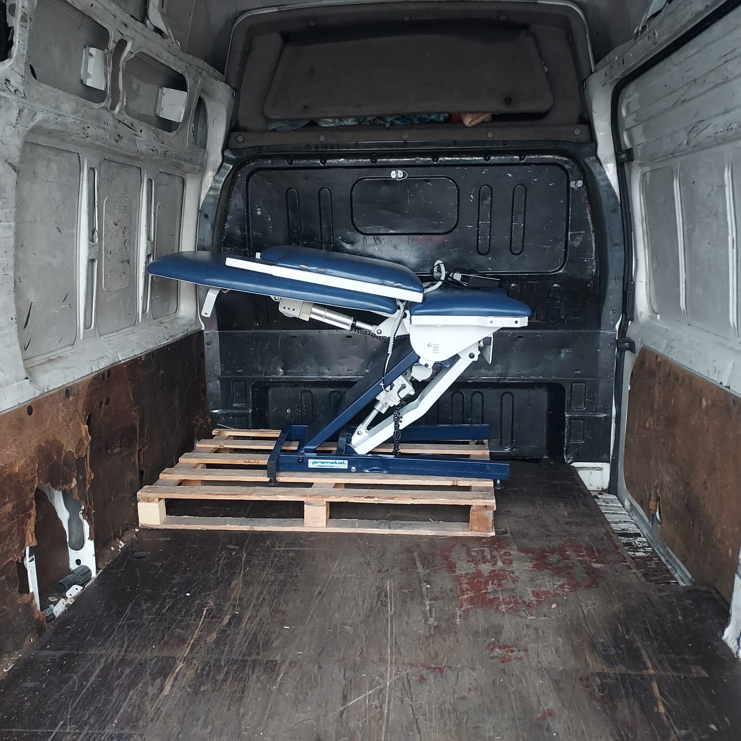 Tres palés de material vario, una camilla, 10 sillas y dos butacas.
