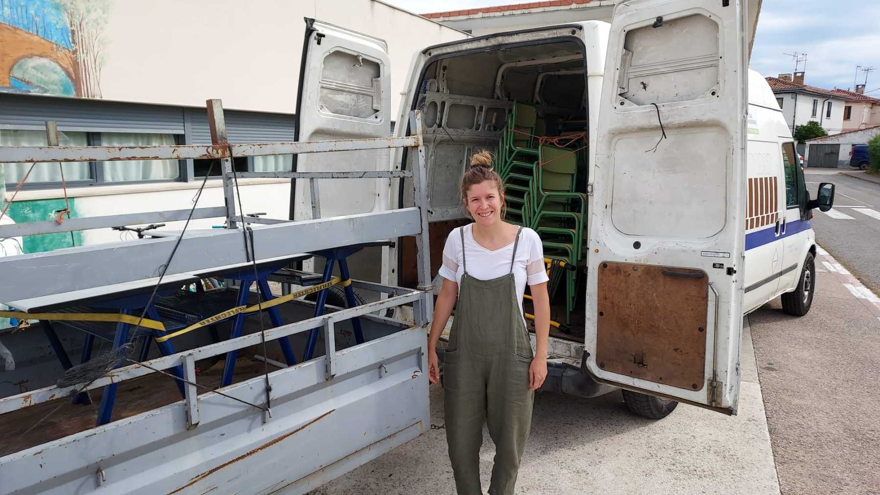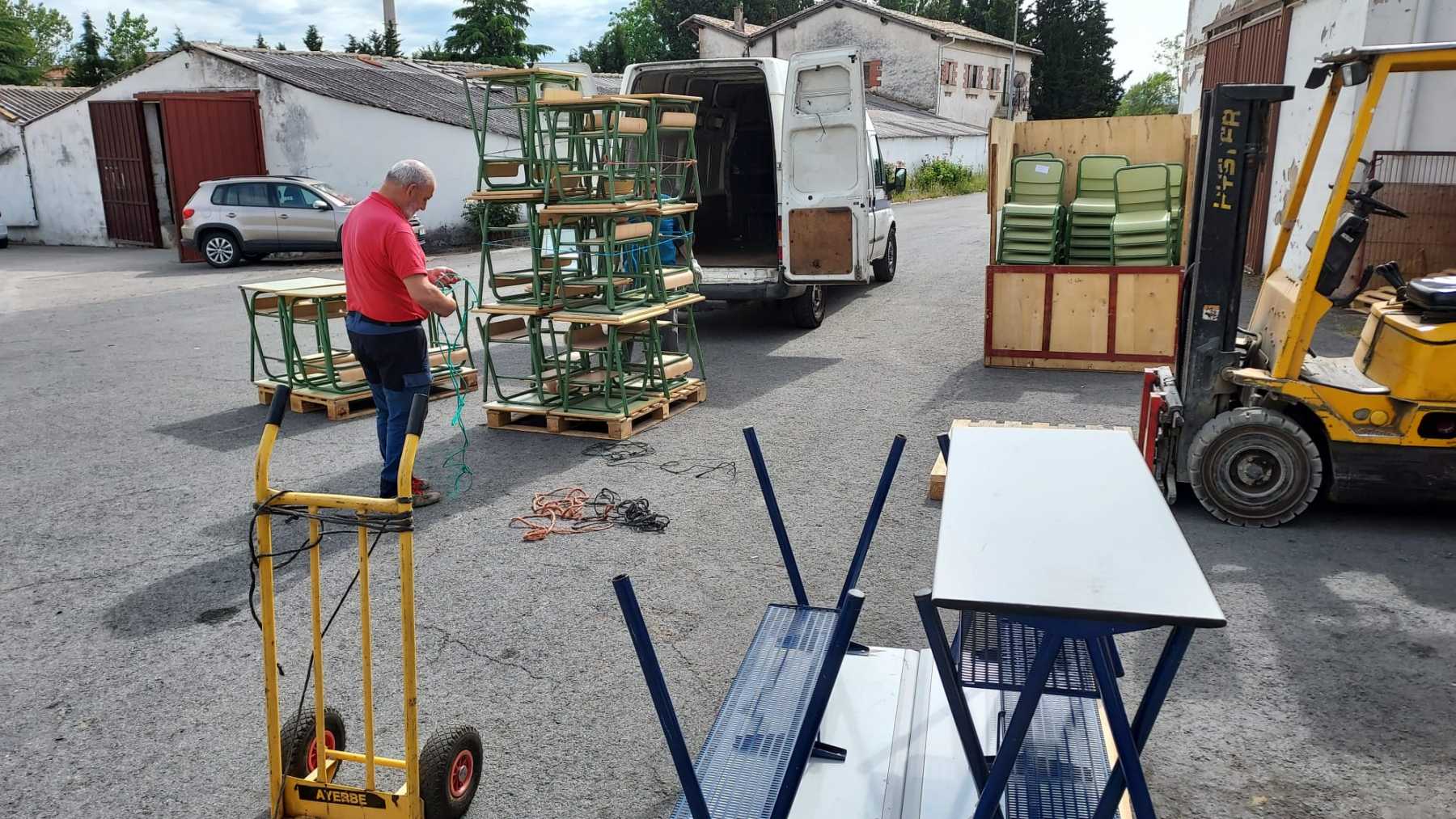 El día 8 de junio hemos recogido de la Ikastola Arangoiti de Lumbier la donación de 43 sillas, 30 pupitres y 3 mesas.