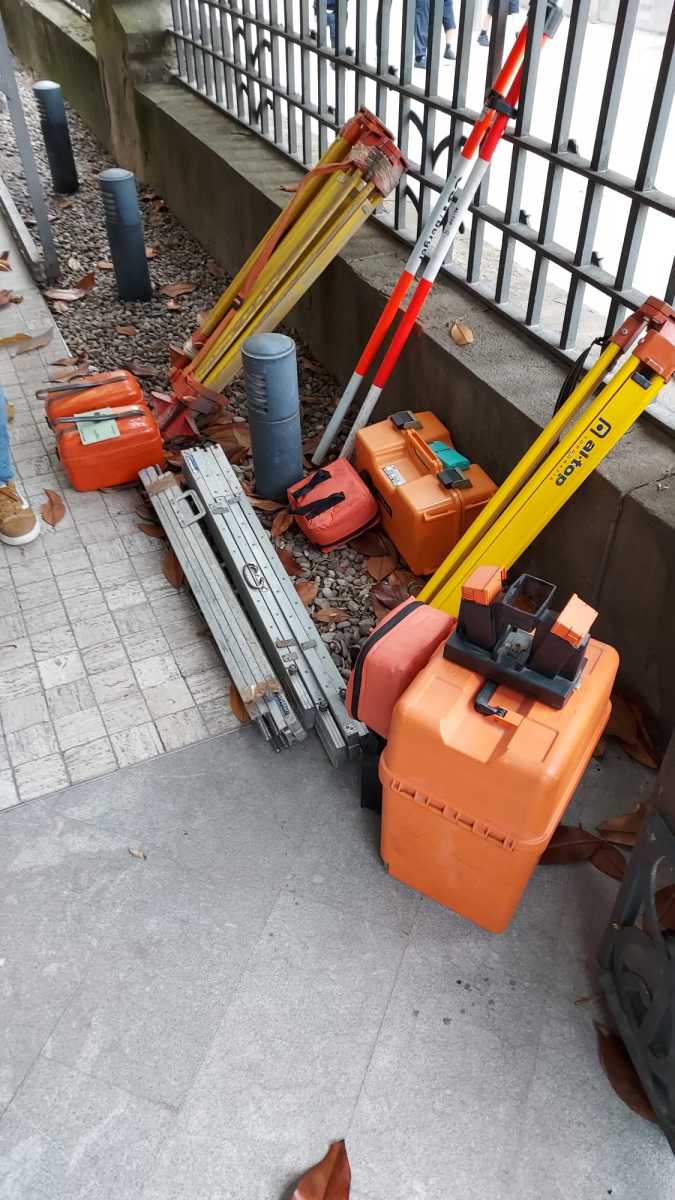 2 estaciones, 3 trípodes, 2 niveles ópticos, 2 jalones, 2 miras, 2 prismas.