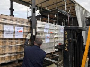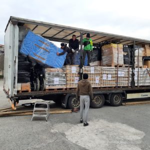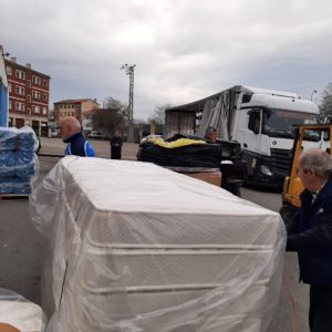 A las 16:30 cargamos un trailer con 22 toneladas de alimentos (patata, coliflor y borraja de conservas Ybarra) y otro montón de sillas de ruedas, colchones, camillas y material de hospital.