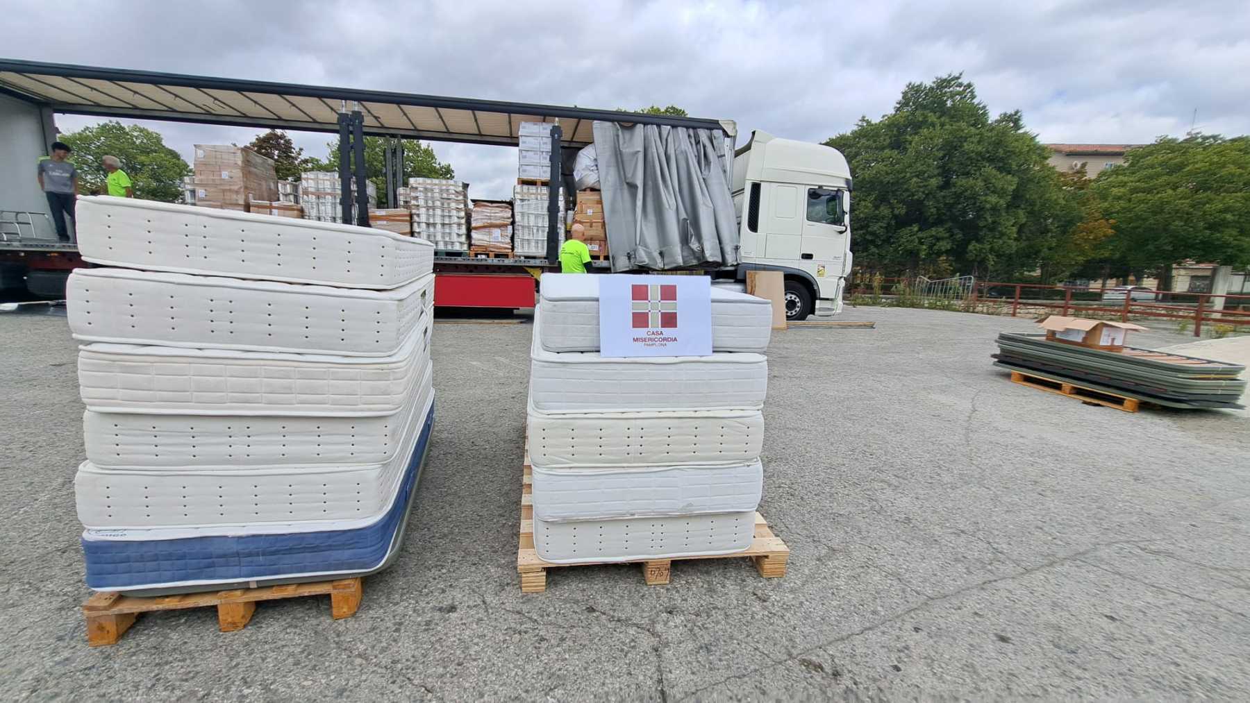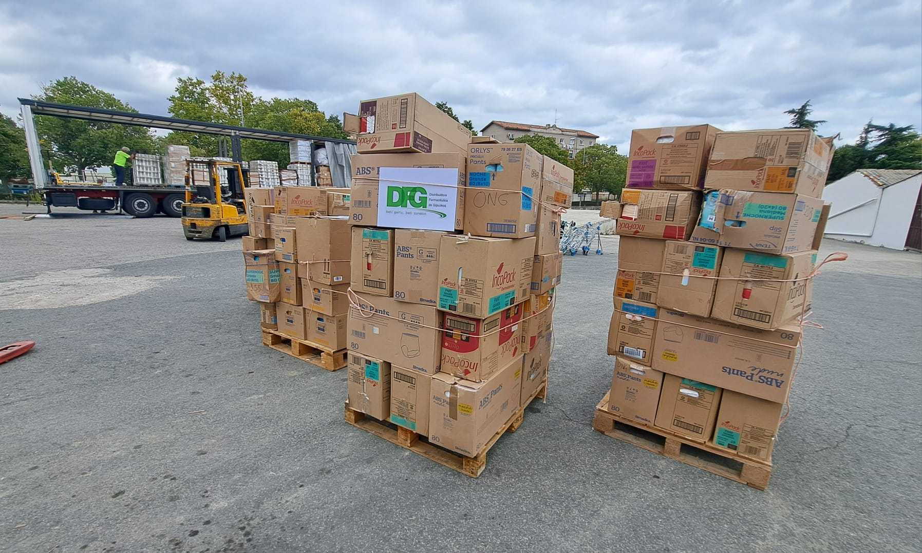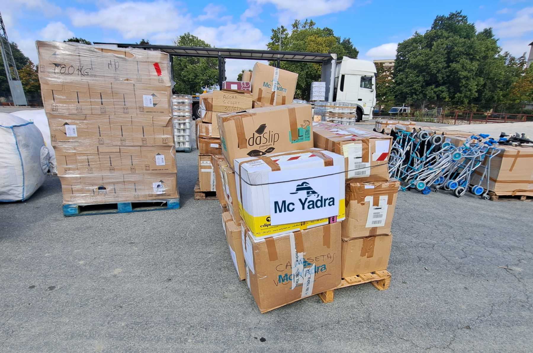 Un cargamento de ayuda humanitaria consistente básicamente en alimentos paletizados de diversos tipos y artículos hospitalarios (camas, camillas, sillas, ortopedia…)