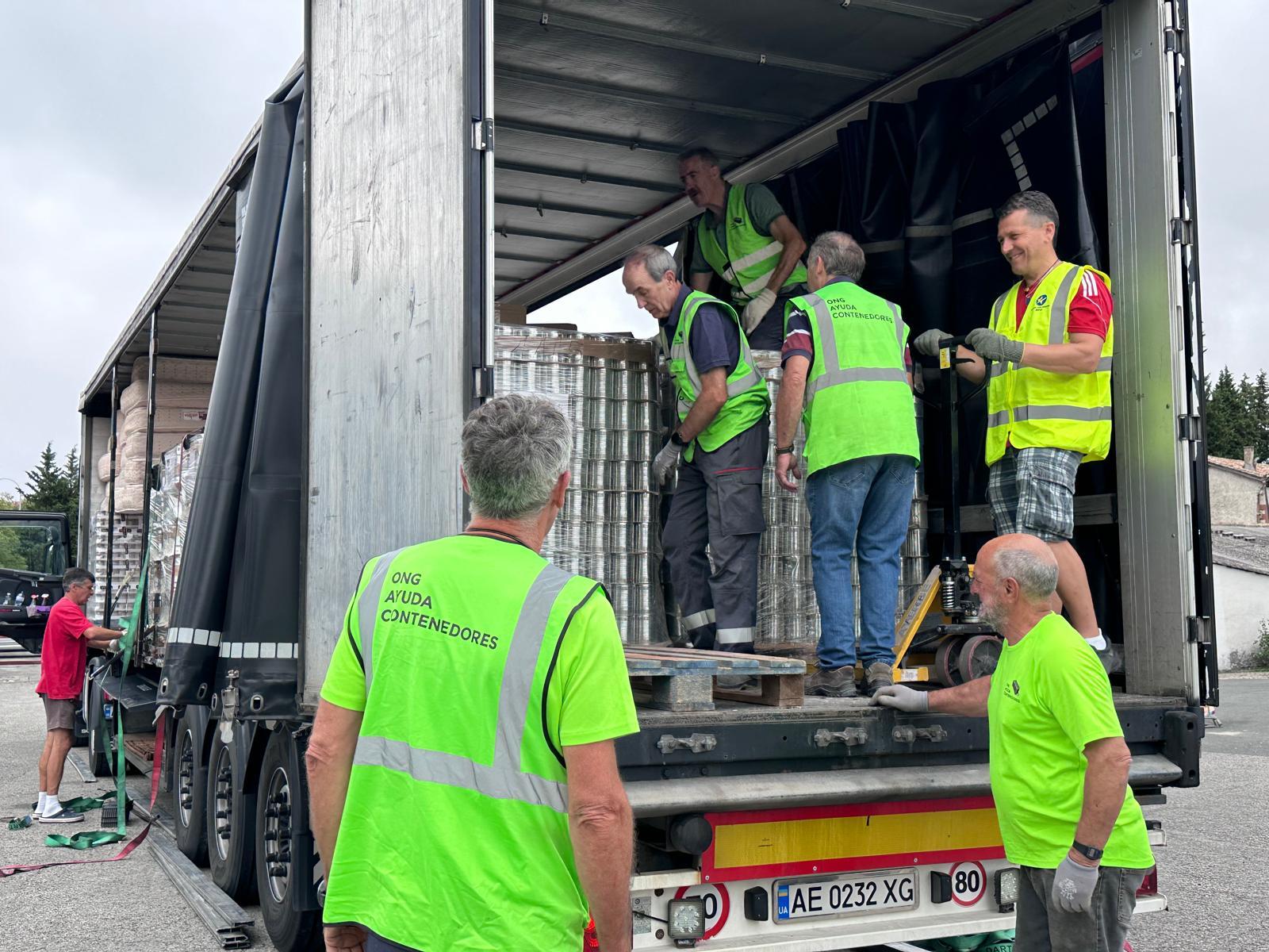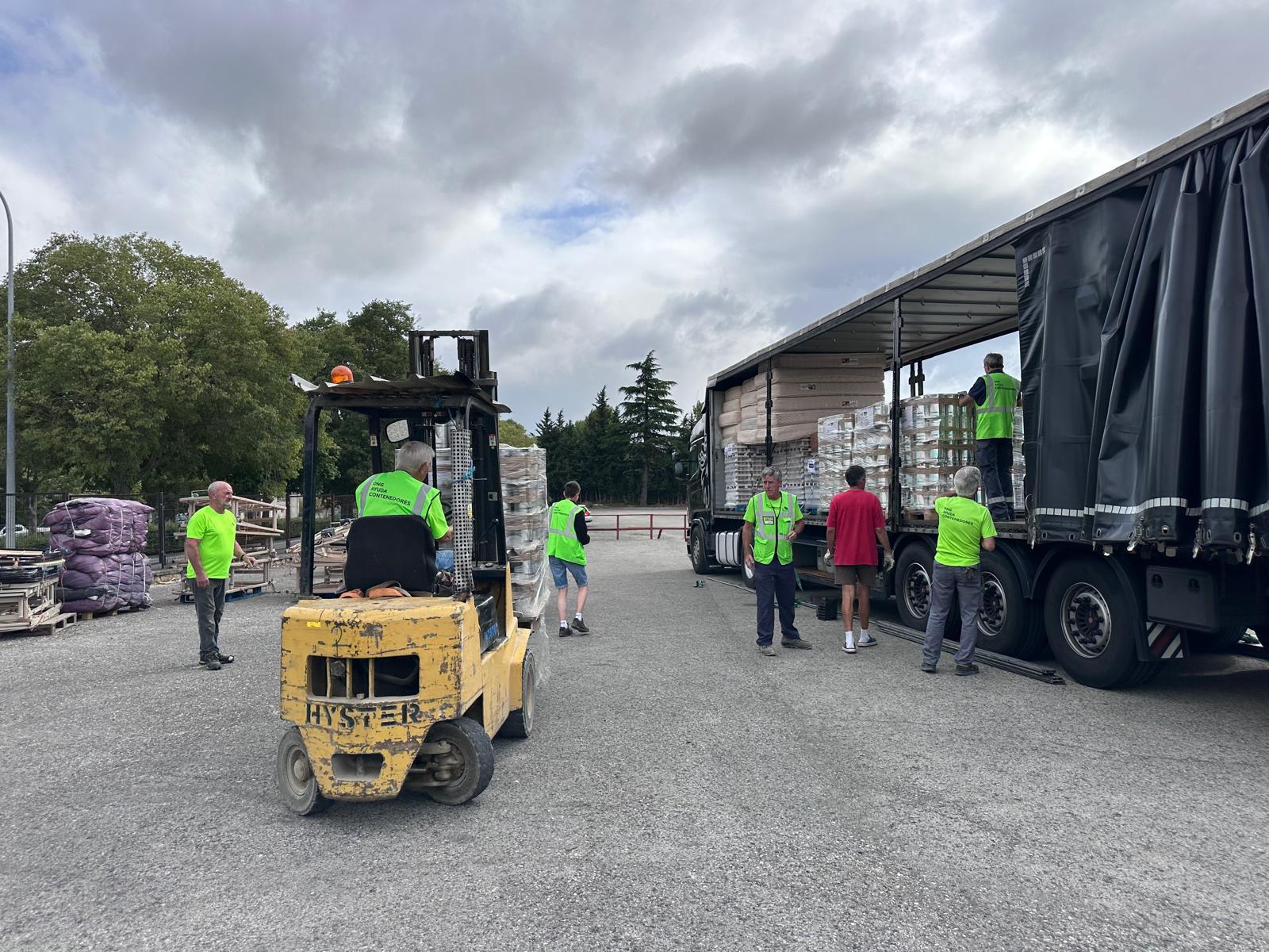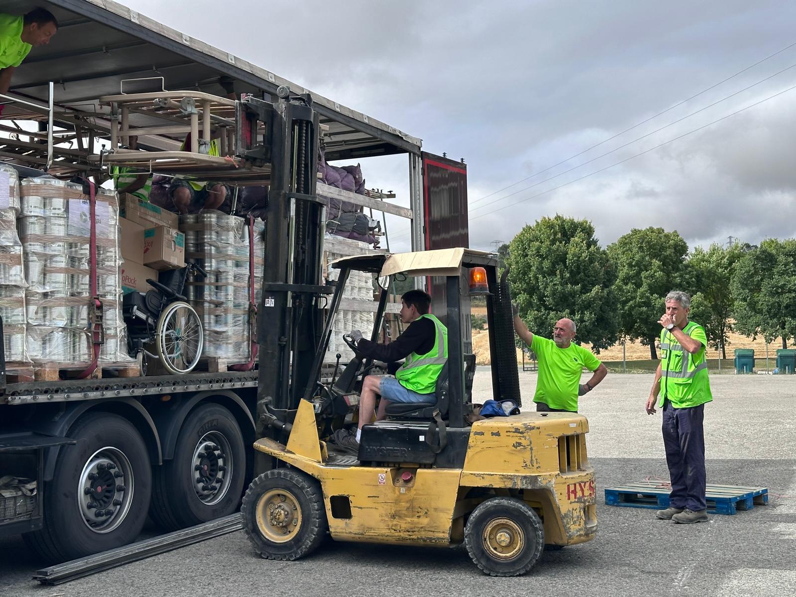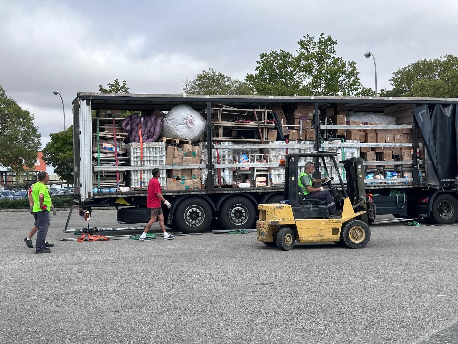 El lunes 28 de julio de 2025, se ha cargado de nuevo un enorme camión tráiler, repleto de materiales de primera necesidad, básicamente alimentos, camillas, colchones, sillas de ruedas y productos de higiene, pañales y  compresas.