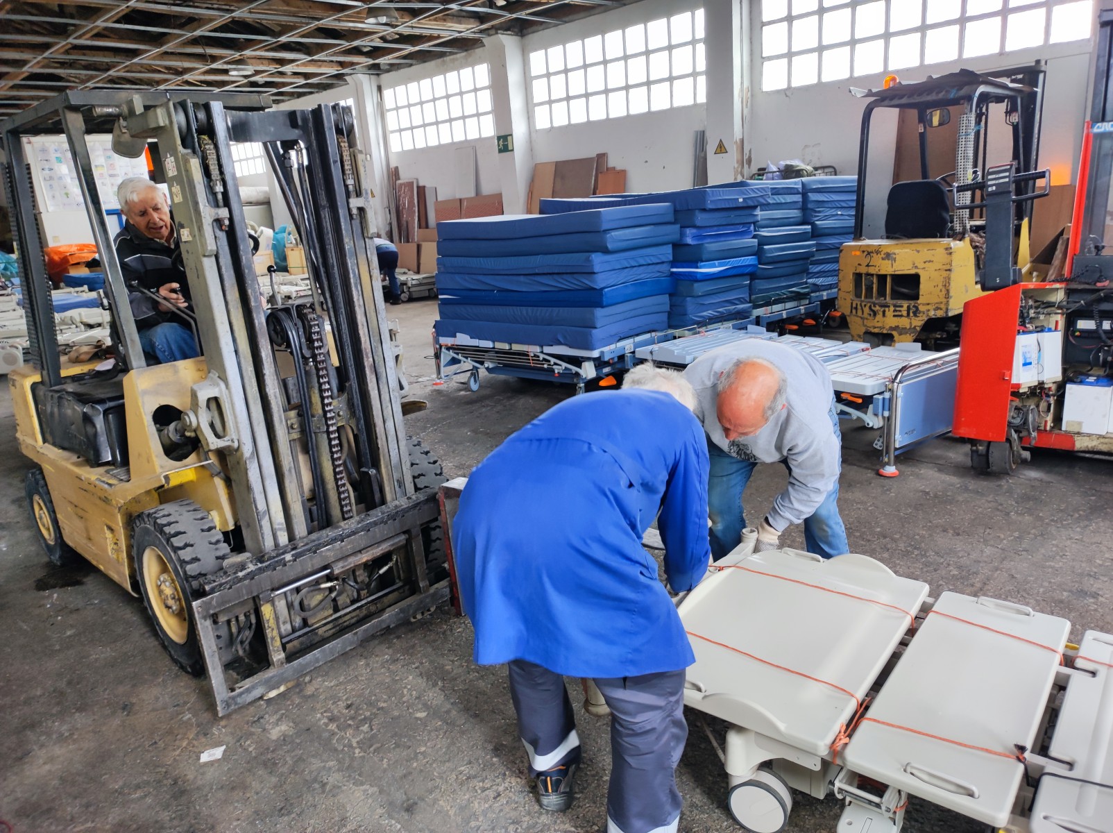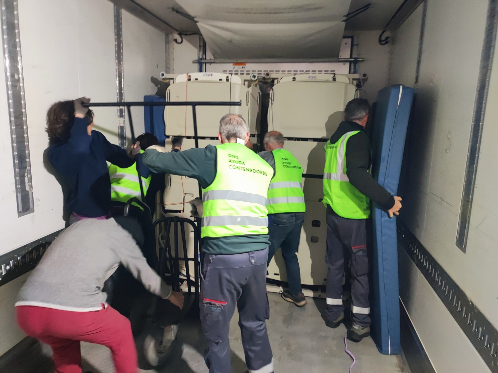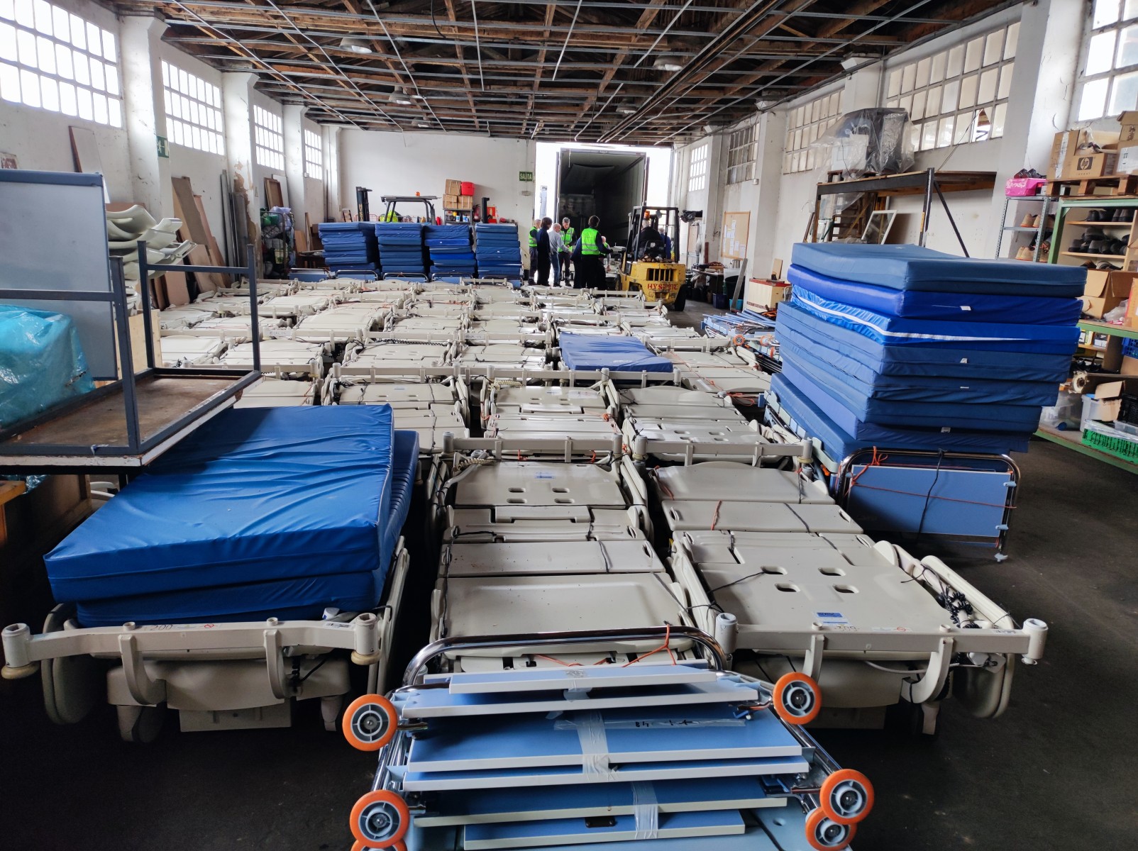 Un tráiler solo con camas que va a la ciudad de Vinnitsa. Un hospital, que hacen de nuevo. Vinitsa es una ciudad grande entre Kuyv y Dnipro. Como todavía es más tranquilo, que en Dnipro, Jarkov o Zaporiza están en proceso de adaptación de edificios para atender gente herida. Civiles y militares.
