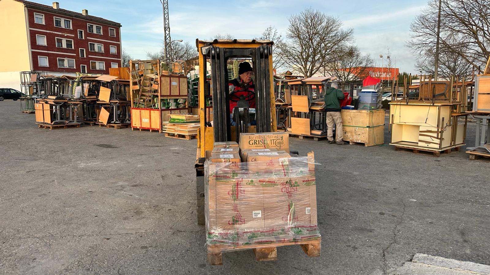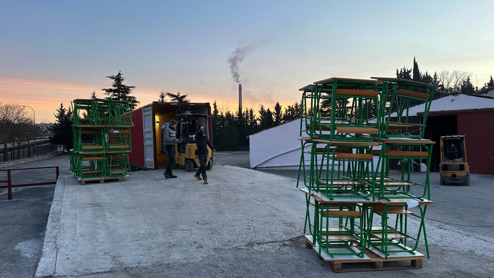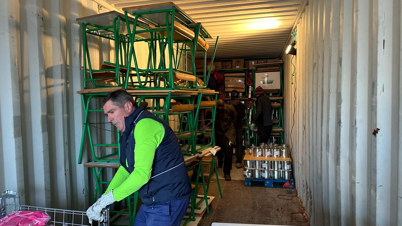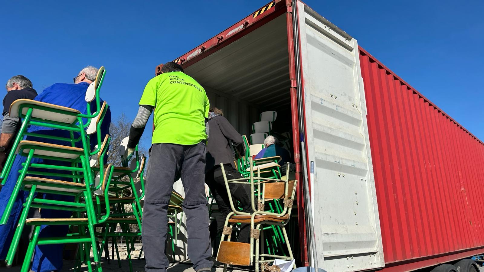 Entre los pupitres se han colocado alimentos, ordenadores, herramientas, materiales hospitalarios y otros materiales. Ha resultado una carga larga y muy laboriosa por el tipo de material cargado y la logística necesaria para el buen aprovechamiento del espacio.