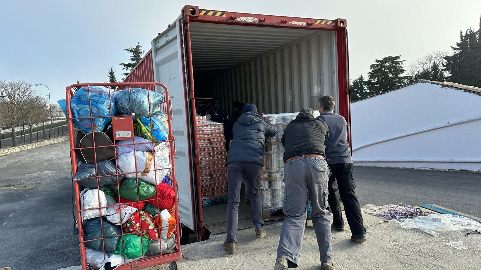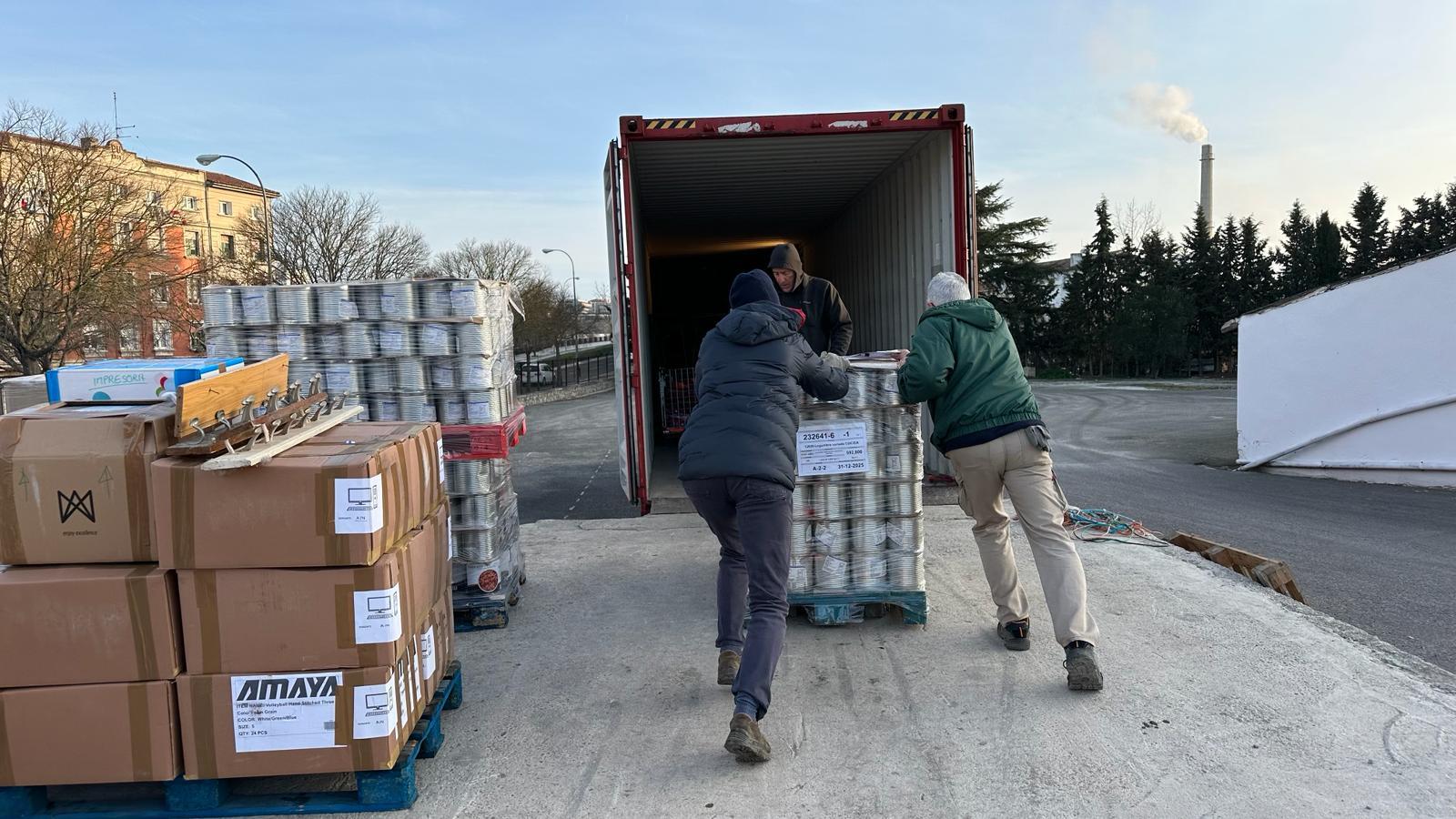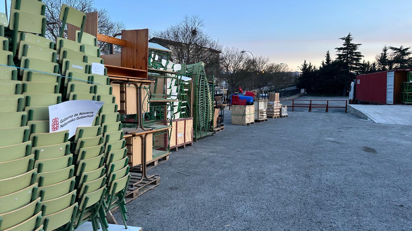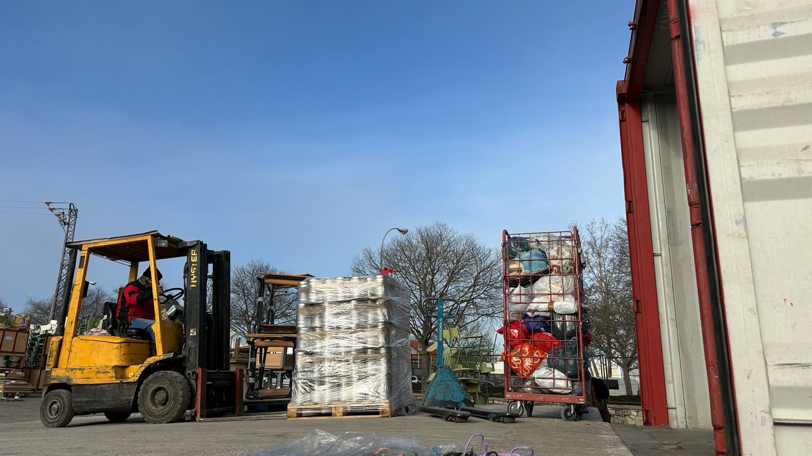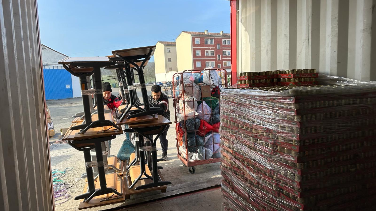 Entre los pupitres se han colocado alimentos, ordenadores, herramientas, materiales hospitalarios y otros materiales. Ha resultado una carga larga y muy laboriosa por el tipo de material cargado y la logística necesaria para el buen aprovechamiento del espacio.