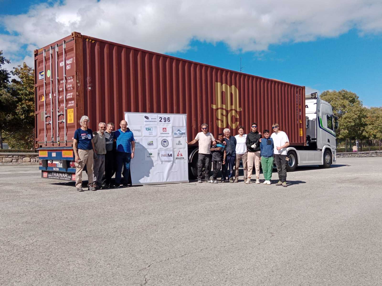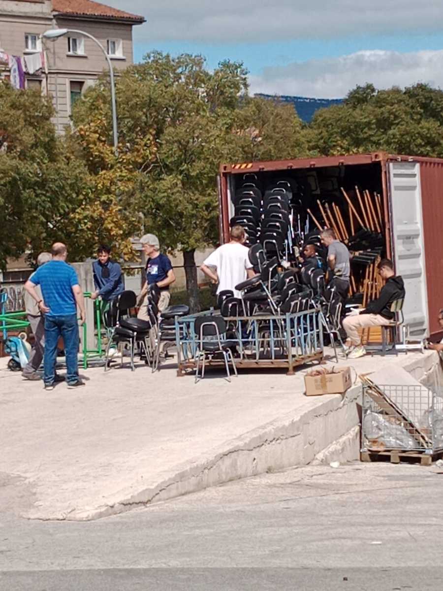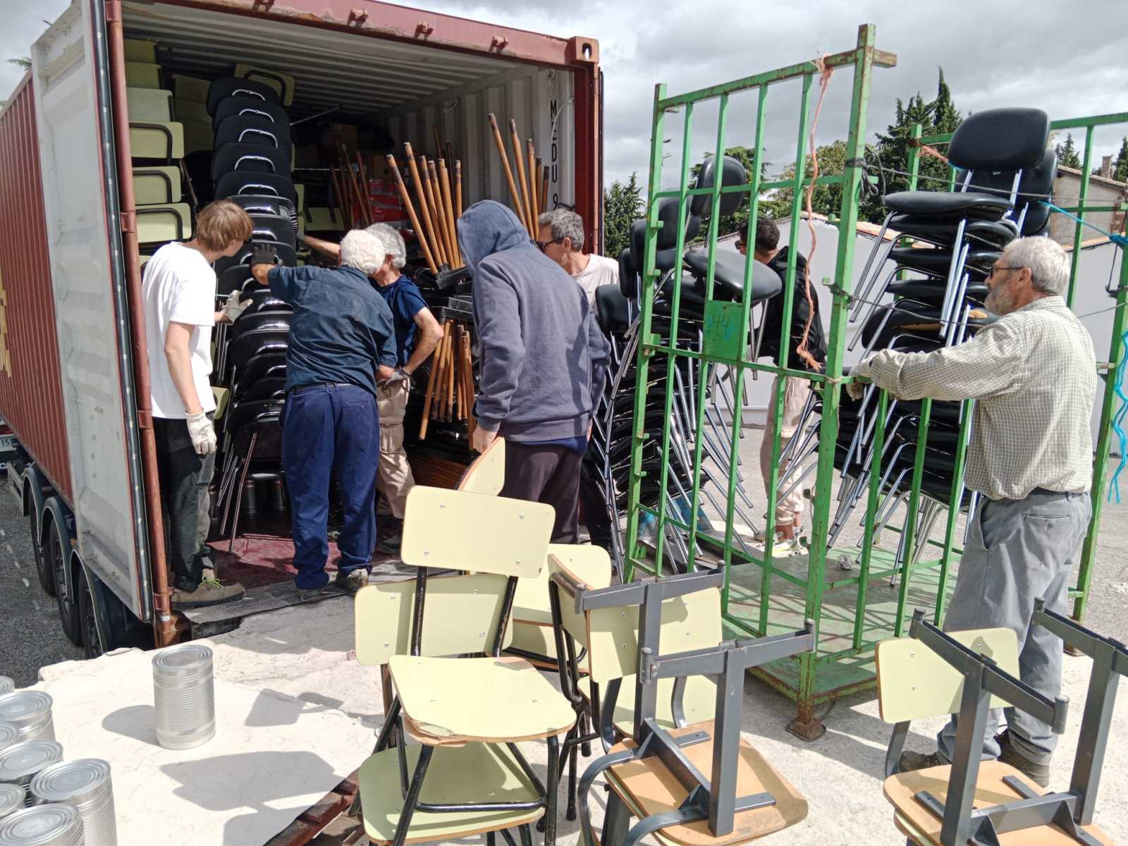 Entre los pupitres se han colocado alimentos, ordenadores y ropa donada por la empresa Mc Yadra. Ha resultado una carga larga y muy laboriosa por el tipo de material cargado y la logística necesaria para el buen aprovechamiento del espacio.