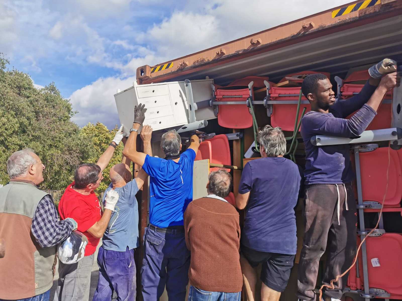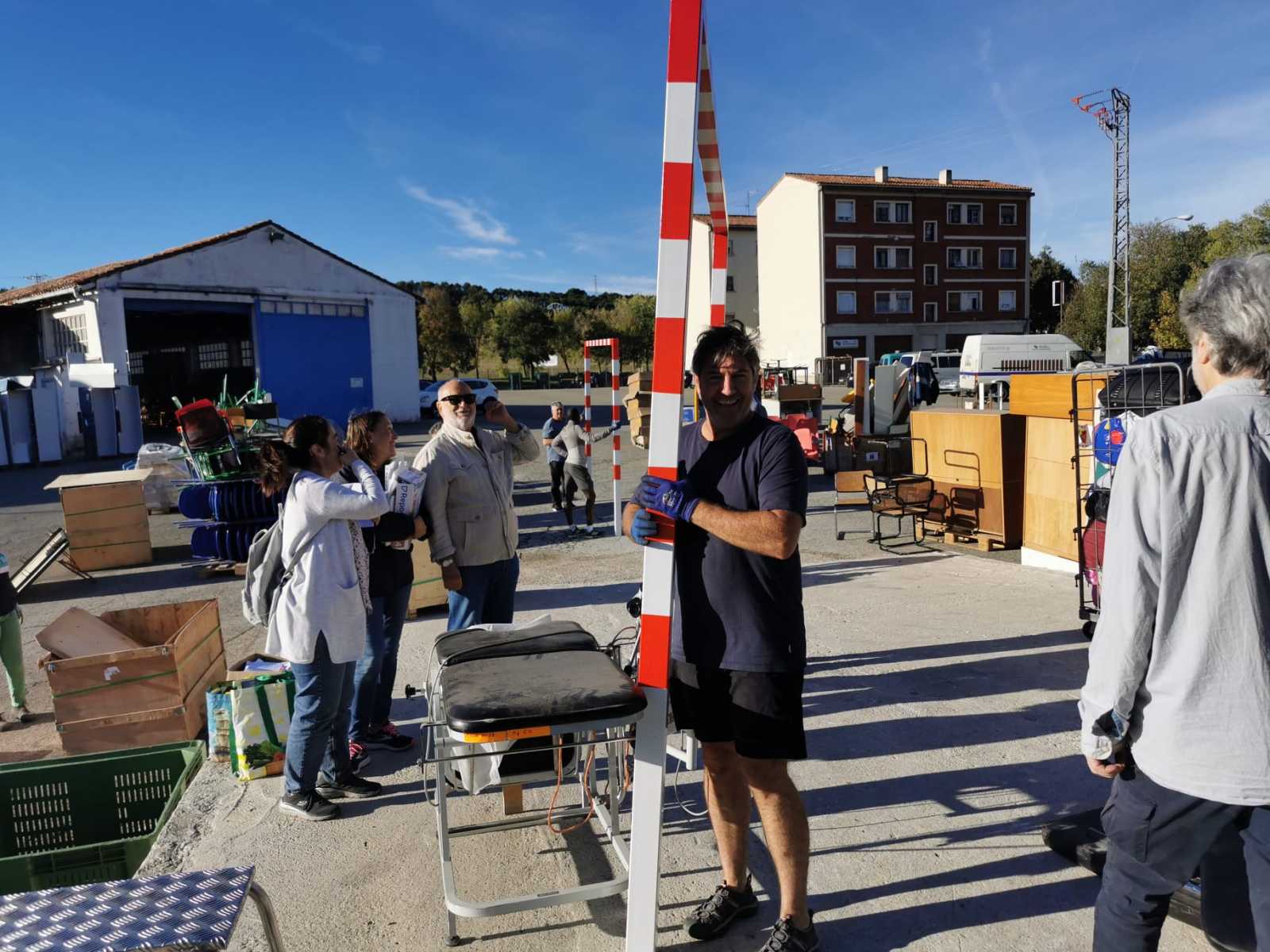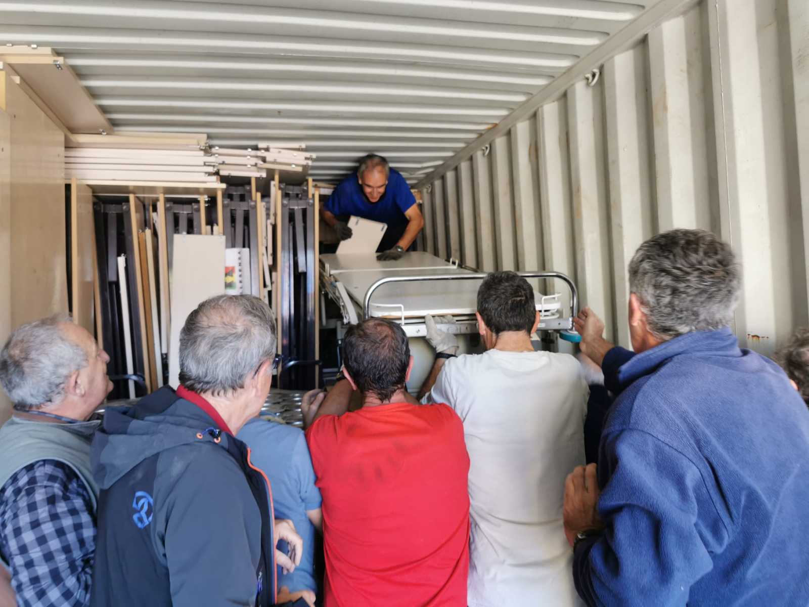 Envíamos material Sanitario al Centro de Salud. Camillas de exploración, camillas de partos , luminarias, monitores , etc. También se cargaron pupitres , mesas, pizarras para al liceo y el colegio de primaria de Kelle.
