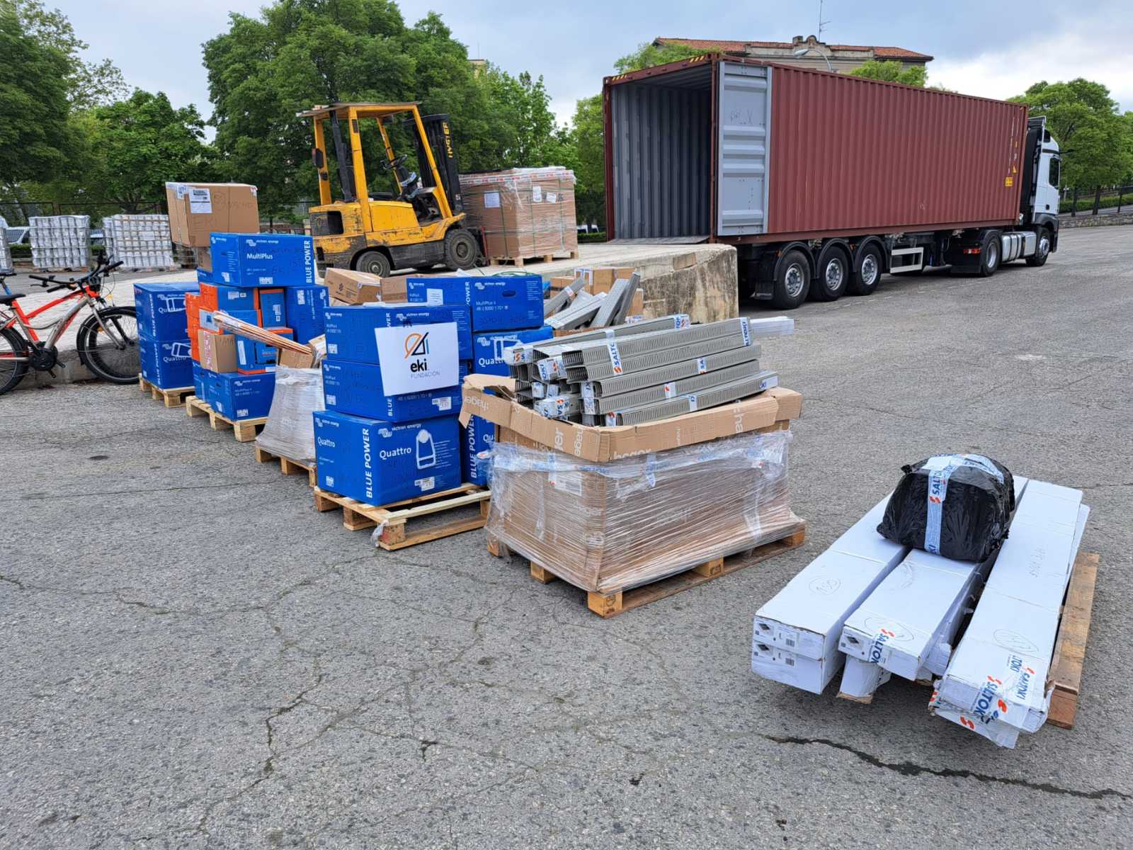 La mitad de la carga del contenedor son materiales para instalaciones fotovoltaicas de la fundación EKI para un total de 8 proyectos.