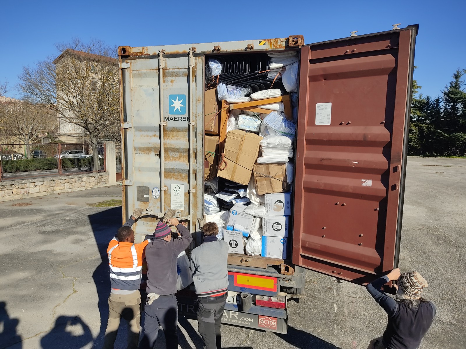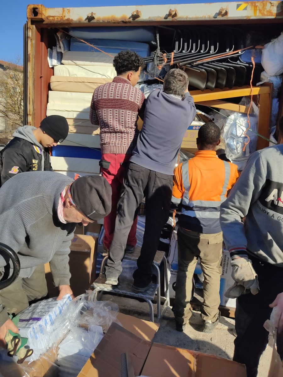 Con todo el mimo y cuidado se ha procedido a la carga -con la increíble maestría del voluntariado de Ayuda Contenedores- para dar cabida ordenadamente y con la cuidada protección necesaria para algunos materiales tan sensibles.