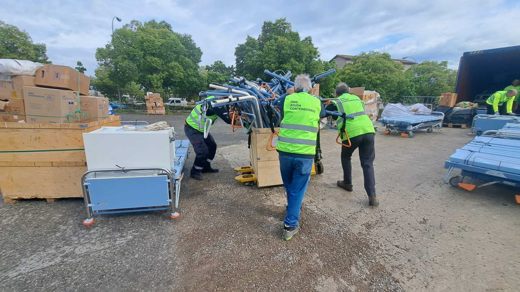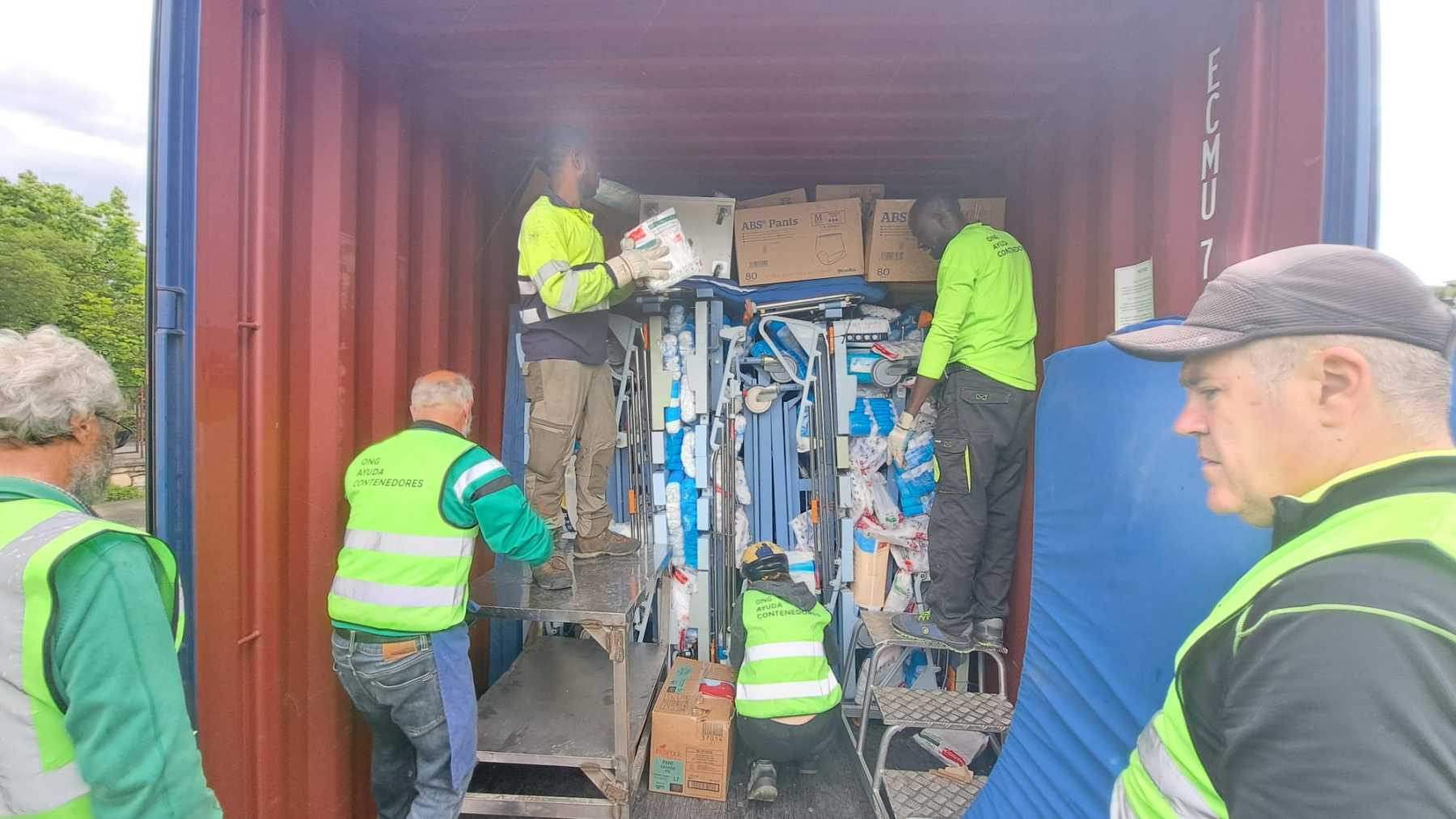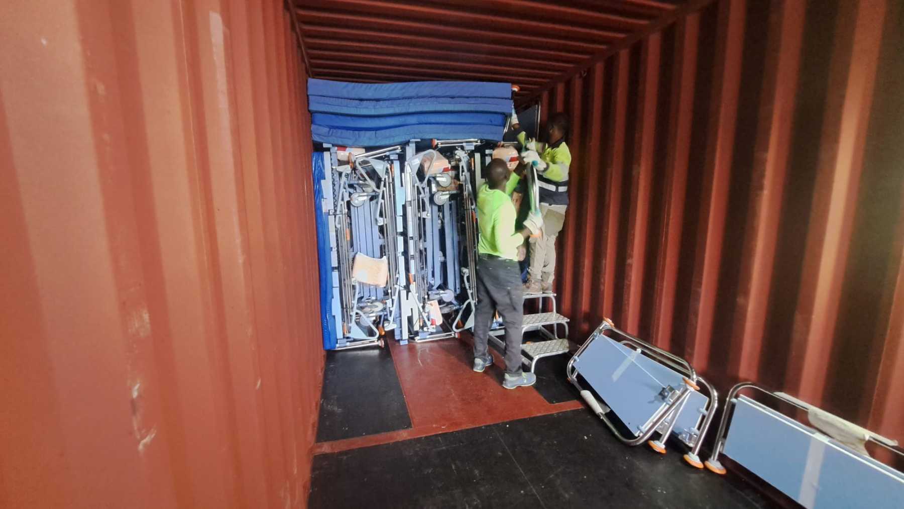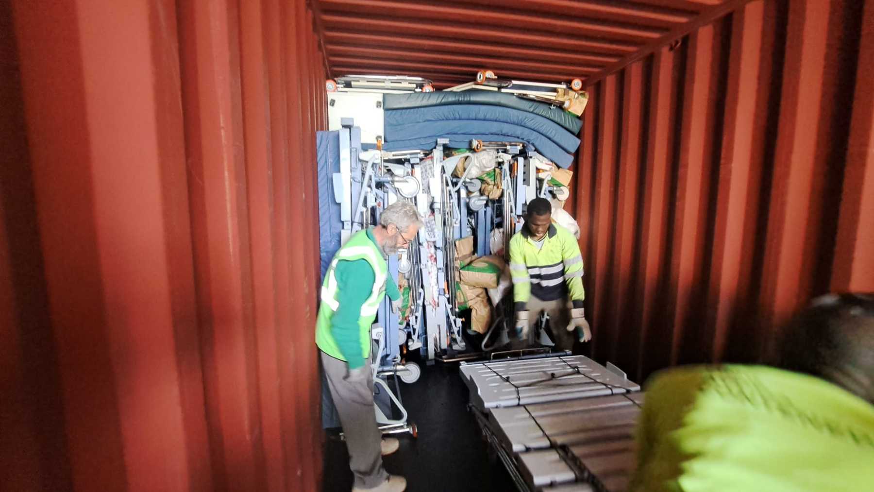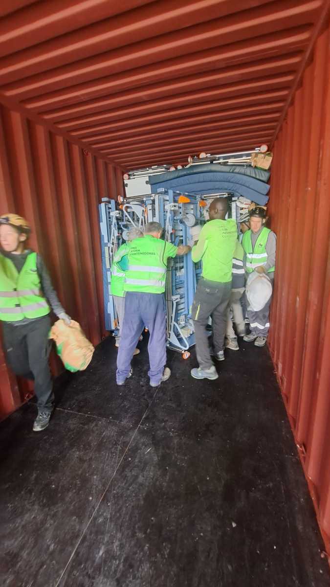 Este contenedor va repleto con 60 camas de Hospital Universitario de Cruces, en Baracaldo, que recogimos esta misma semana, con sus colchones, potencias y goteros. Además todos los huecos se han rellenado con con pijamas, batas, sábanas, y elementos de higiene: compresas, pañales, empapadores… También zapatos de trabajo.