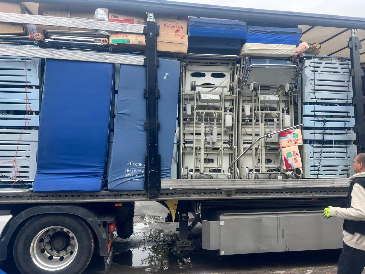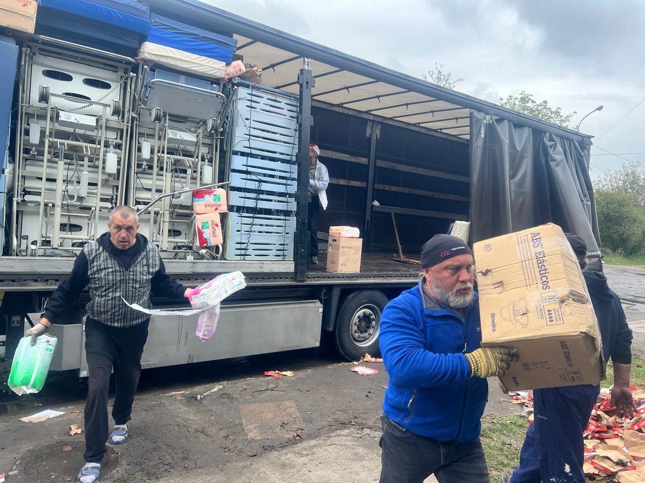 Además de camas se cargaron materiales de higiene, pañales, compresas, vendas, sillas de ruedas, camillas y comida enlatada.