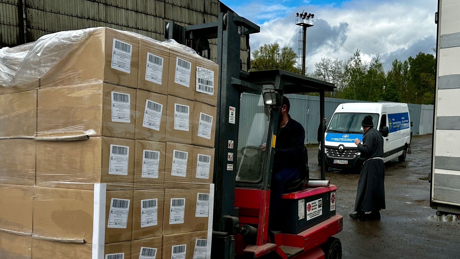 Enviamos ayuda humanitaria consistente básicamente en alimentos paletizados, productos de higiene personal y artículos hospitalarios (camillas, sillas, ortopedia…) atendiendo la solicitud de la Orden Iglesia Greco Católica.
