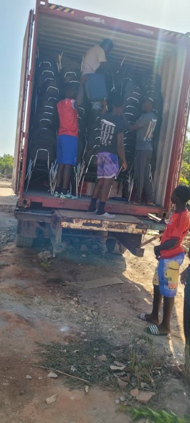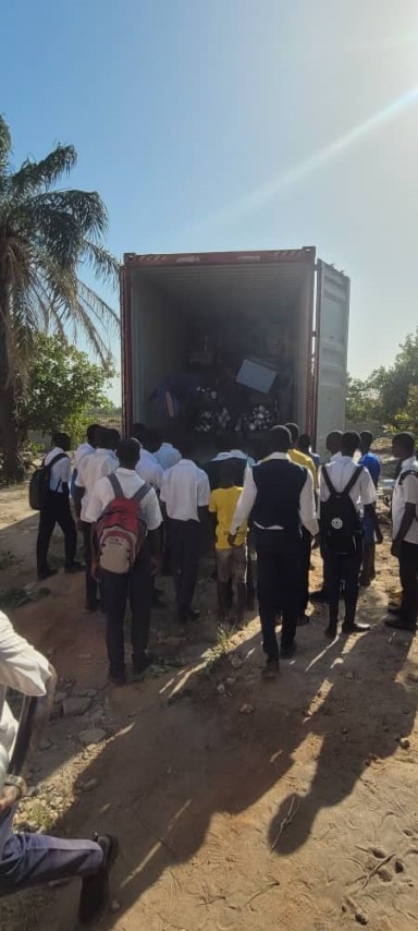 Lo ha recibido el misionero salesiano roncalés Carlos Berro. Se cargaron fundamentalmente pupitres para tratar de solucionar la escasez de estos materiales en las escuelas de Gambia. Nos cuenta Carlos que “ Gambia es uno de los quince países más pobres de la Tierra. No tiene apenas recursos naturales o minas o petróleo o cosas así. La gente vive del campo, de la pesca, del turismo… Difícil hacerse rico aquí. La enseñanza básica es obligatoria, el nivel educativo es muy bajo, los salarios de los profesores están a la misma altura. Los profesores, con tan bajos estímulos, no suelen tener la motivación ni la preparación adecuadas. El gobierno paga los salarios de los profesores (200 euros al mes), pero el otro dinero para mantenimiento del material o de la escuela, para actividades escolares, deportes, pintura… es más bajo todavía. Así que los pupitres son muy viejos y en mal estado»