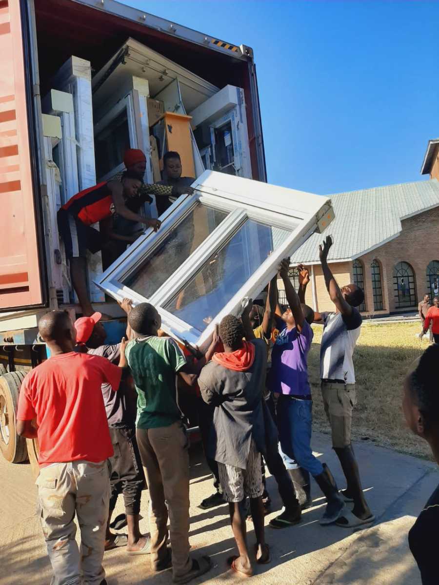 Un cargamento de pupitres, sillas, mesas, ordenadores, pizarras … y un montón de materiales más para la construcción y equipación de la escuela secundaria que están construyendo en Benga, Distrito de Nkhotakota Malawi.