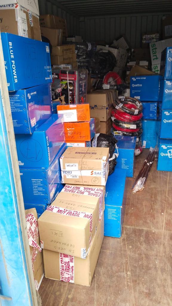 La mitad de la carga del contenedor eran materiales para instalaciones fotovoltaicas de la fundación EKI para un total de 8 proyectos.